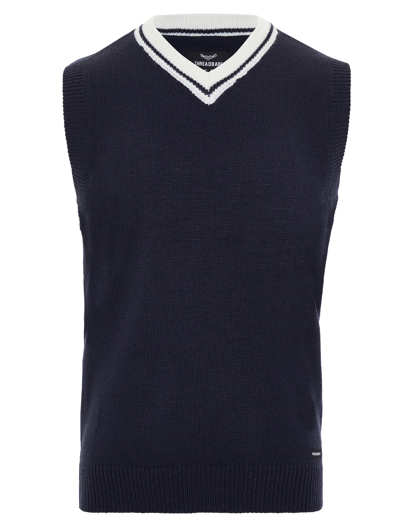 Cut in a regular fit, this knitted sweater vest has a relaxed feel and can be layered or worn on its own. Designed with a contrast v neck with tipping, and ribbed hem for a classic yet sporty feel. Finished with our woven Threadbare label above the hem for sought-after brand recognition.