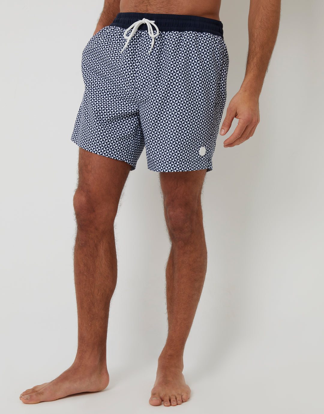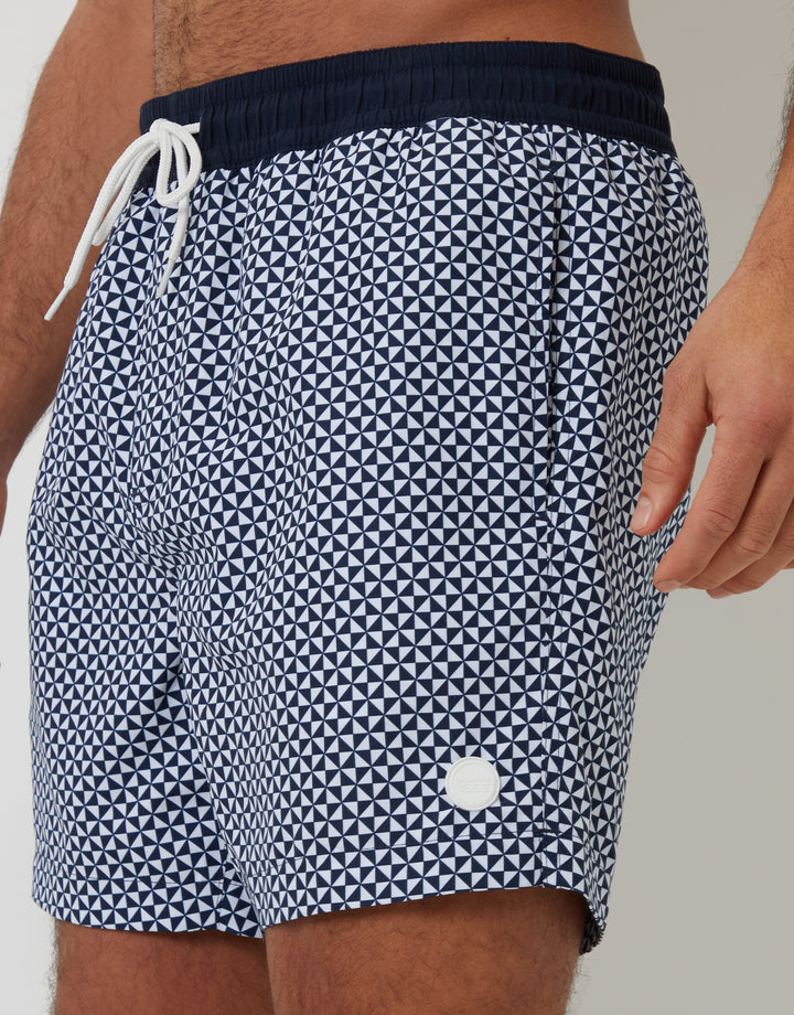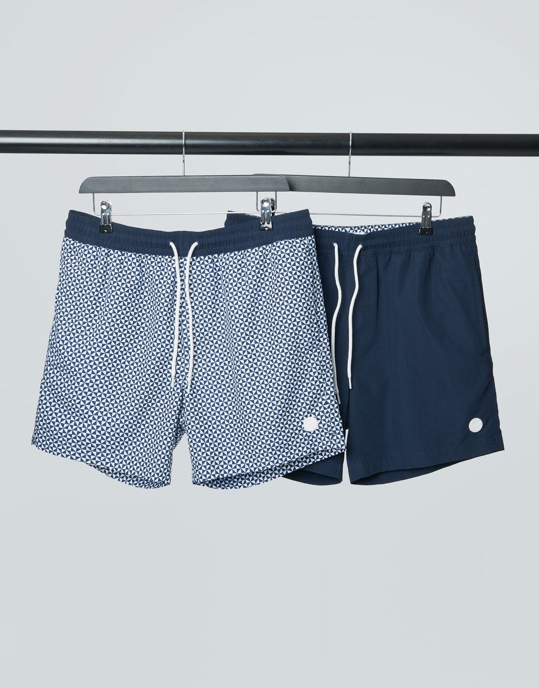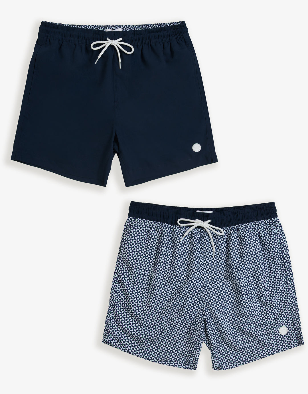 One pair in navy with geometric print lining details, and the second in all-over geometric print with navy lining details.