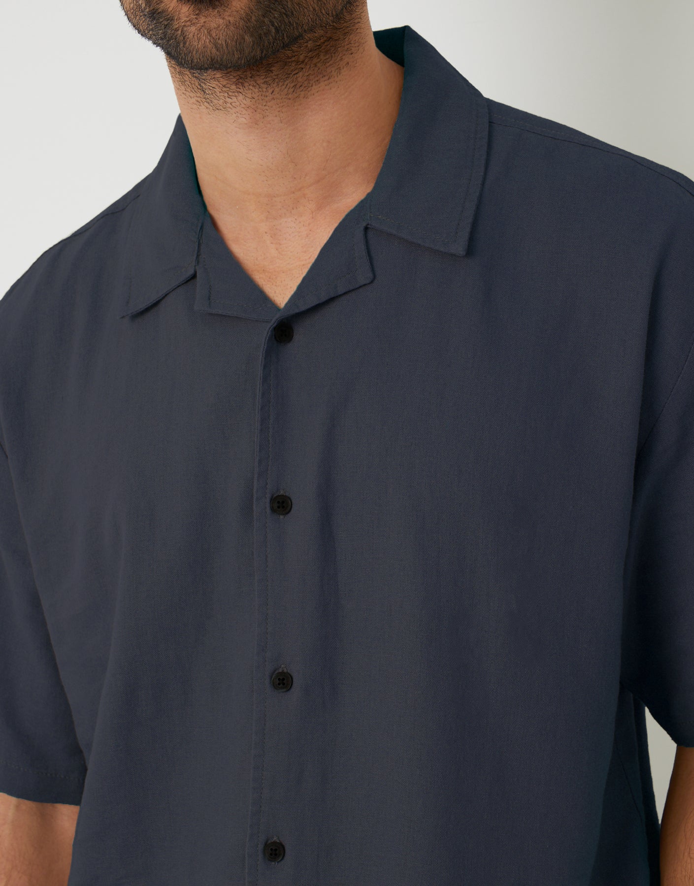 Navy Linen Blend Revere Collar Short Sleeve Shirt