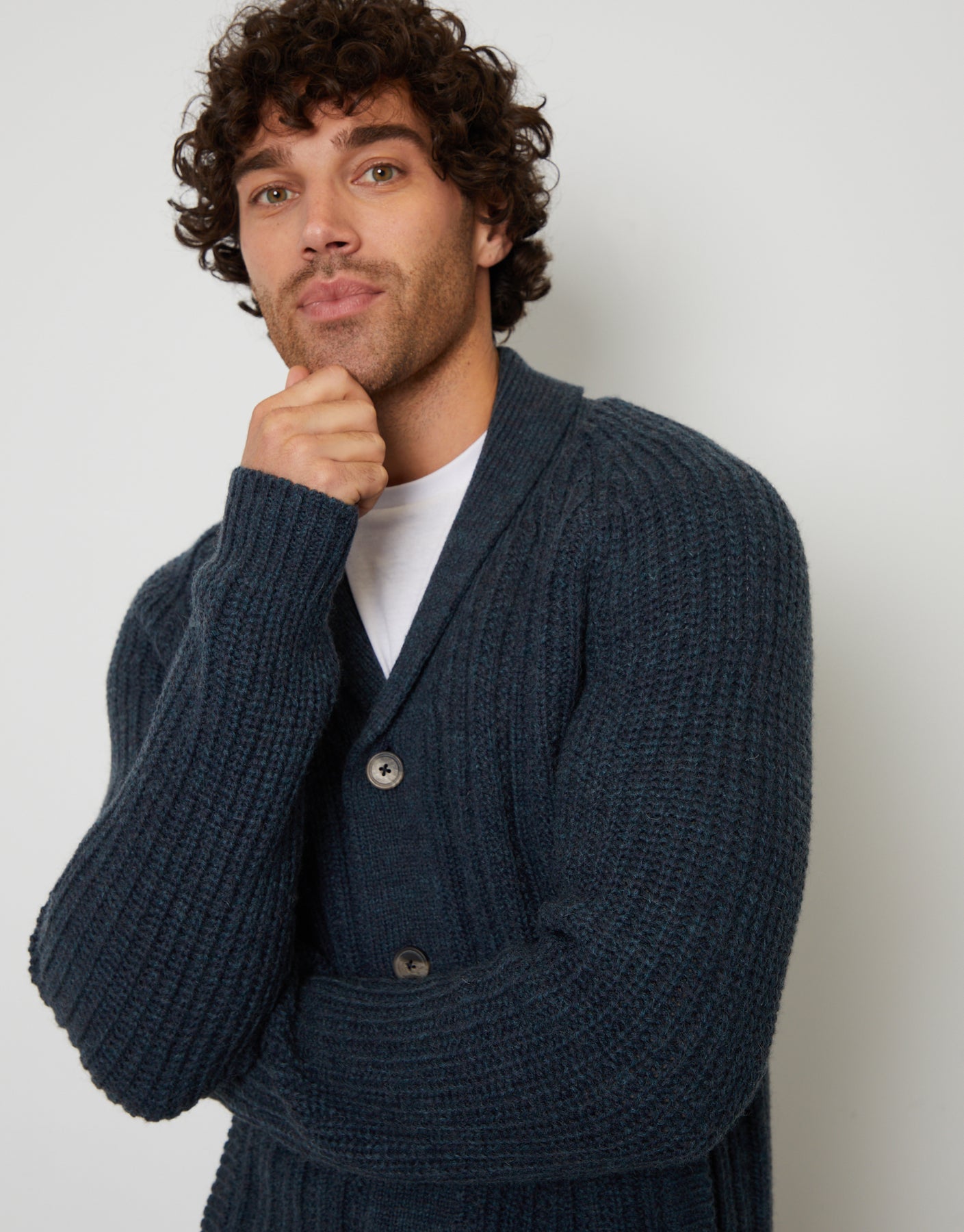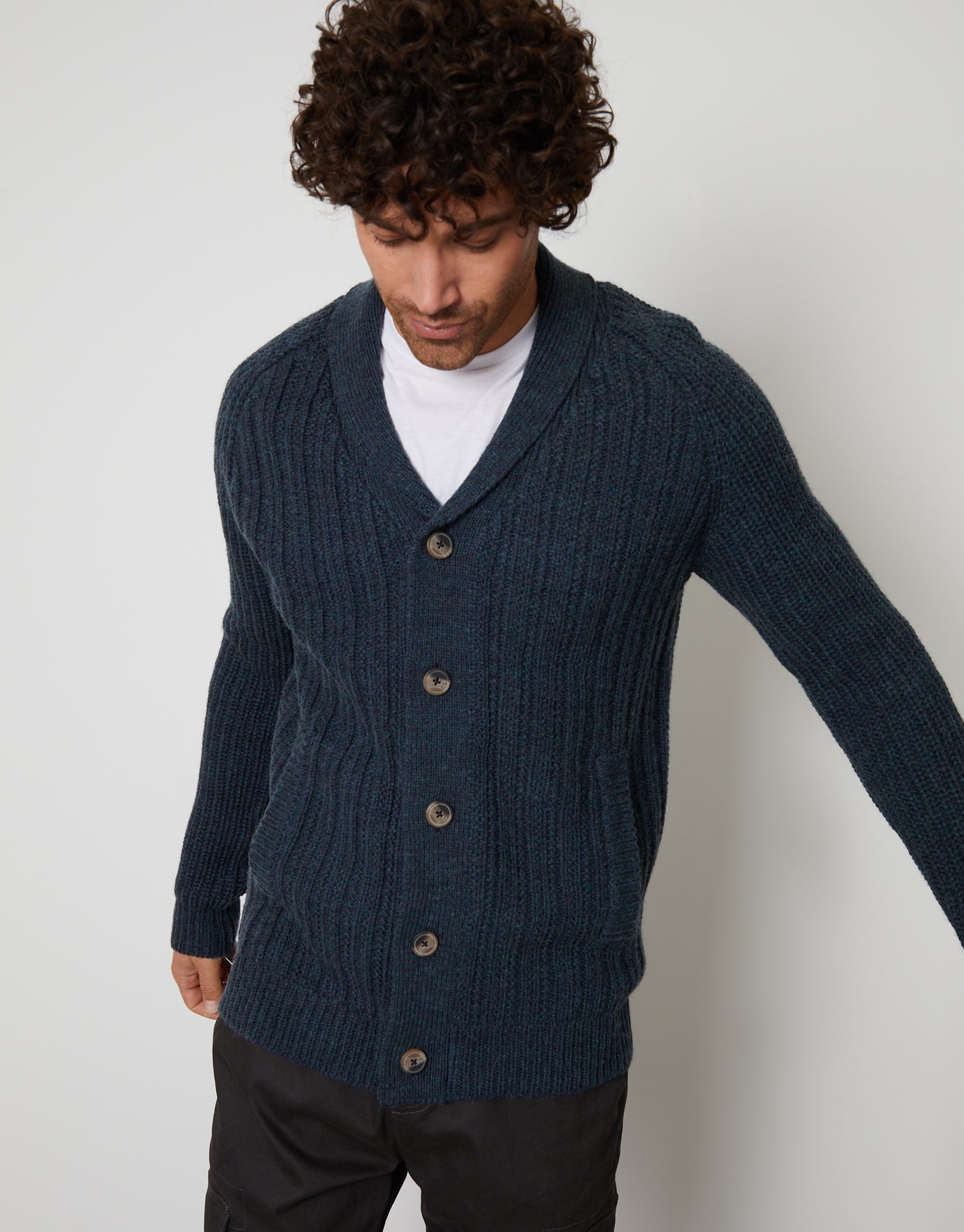 With a stylish shawl collar and in an all-over cable knit, this raglan sleeve style knitted jumper has ribbed cuffs and hem for comfort and a full button down fastening.