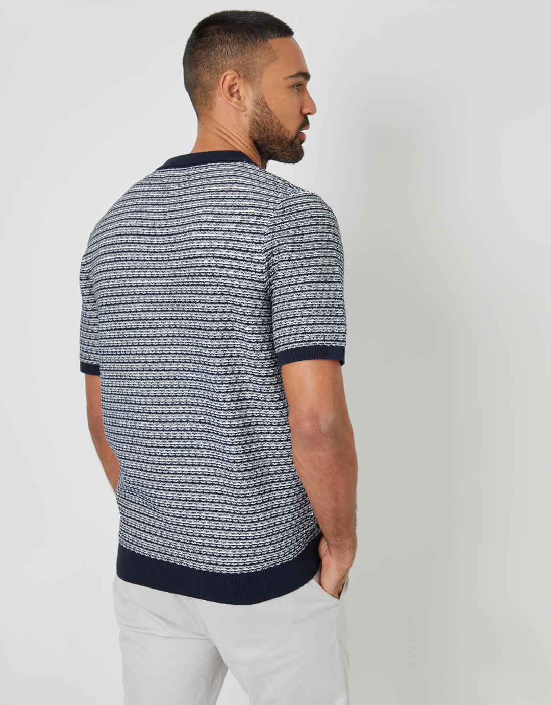 Complete your capsule wardrobe with our striped trophy neck textured knitted polo shirt.
