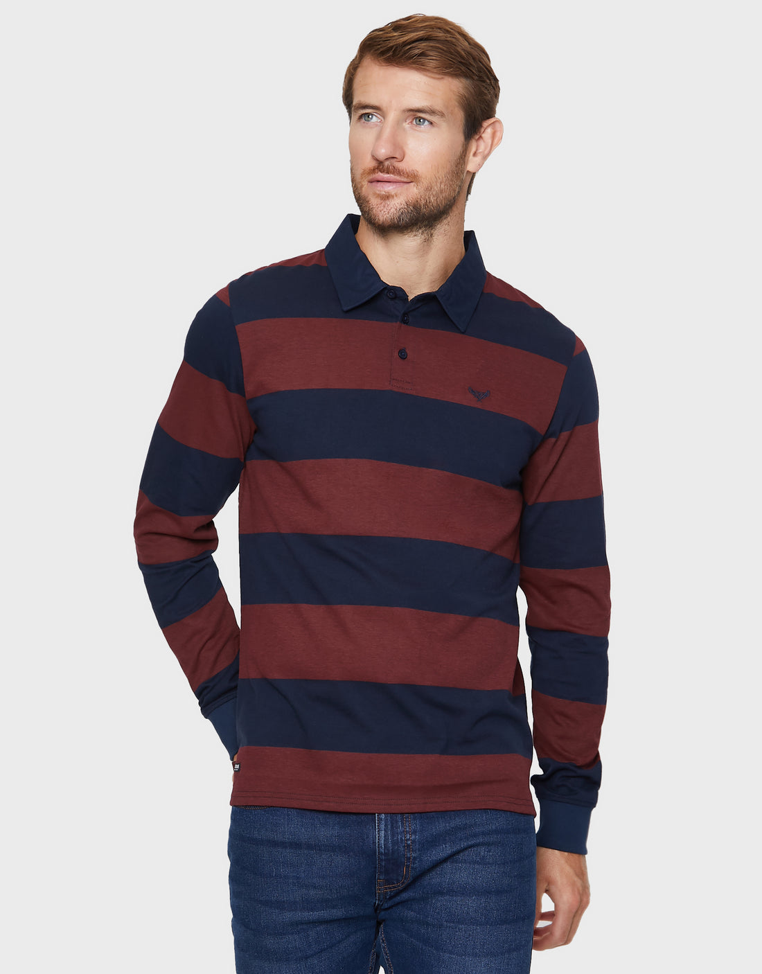 Casual doesn't get much better than this navy and burgundy colourblock rugby polo shirt.