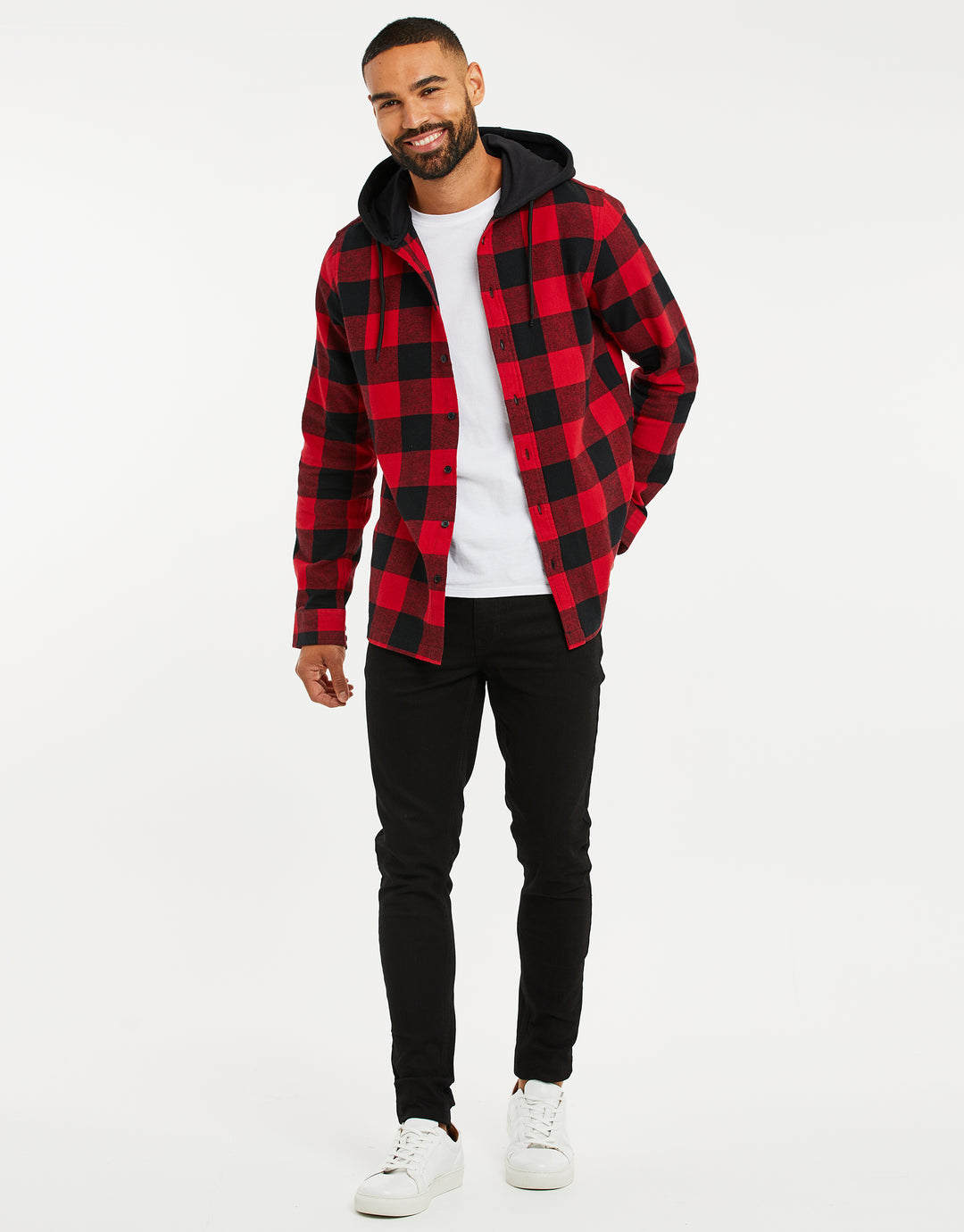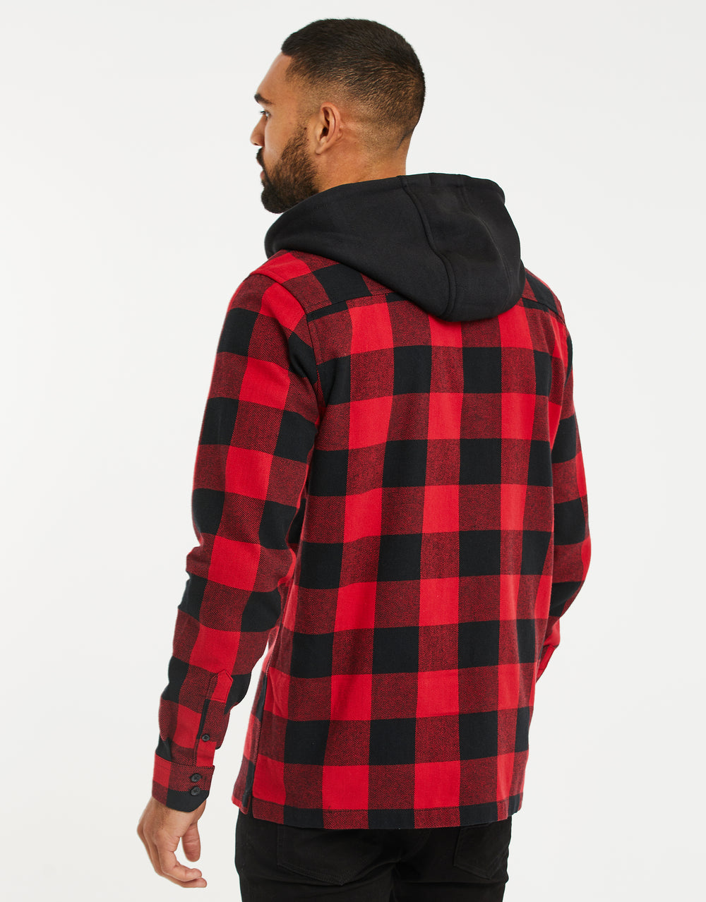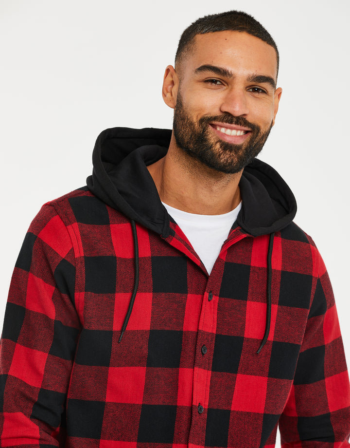 With jersey fleece black hood and drawcords, this shirt in an all-over red and black check fastens with matte black buttons and is finished with double button cuffs.