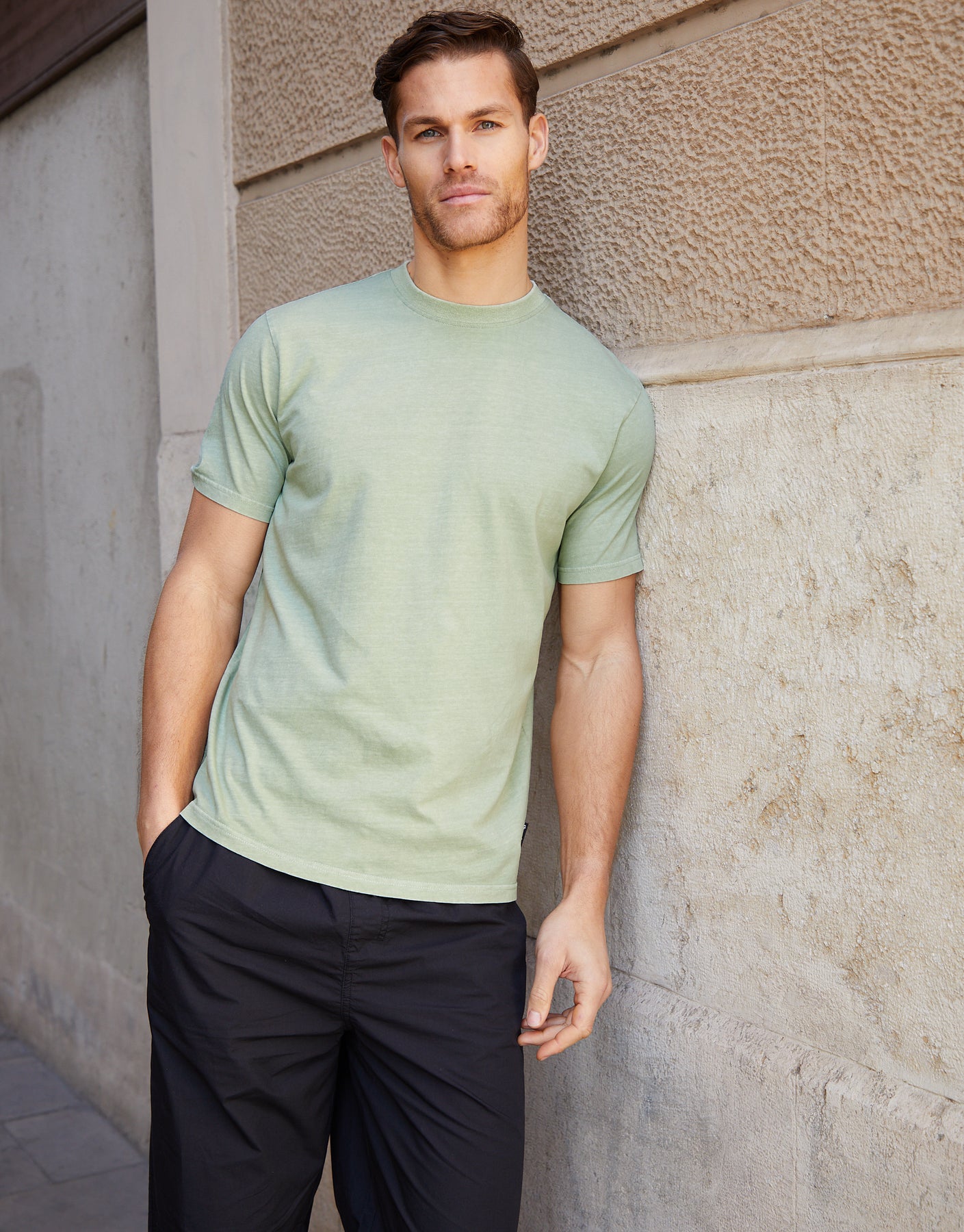 Cut in a regular fit, this tee is made from a cotton single jersey fabric in a sage acid wash and has a chunky ribbed round collar and short set in sleeves.