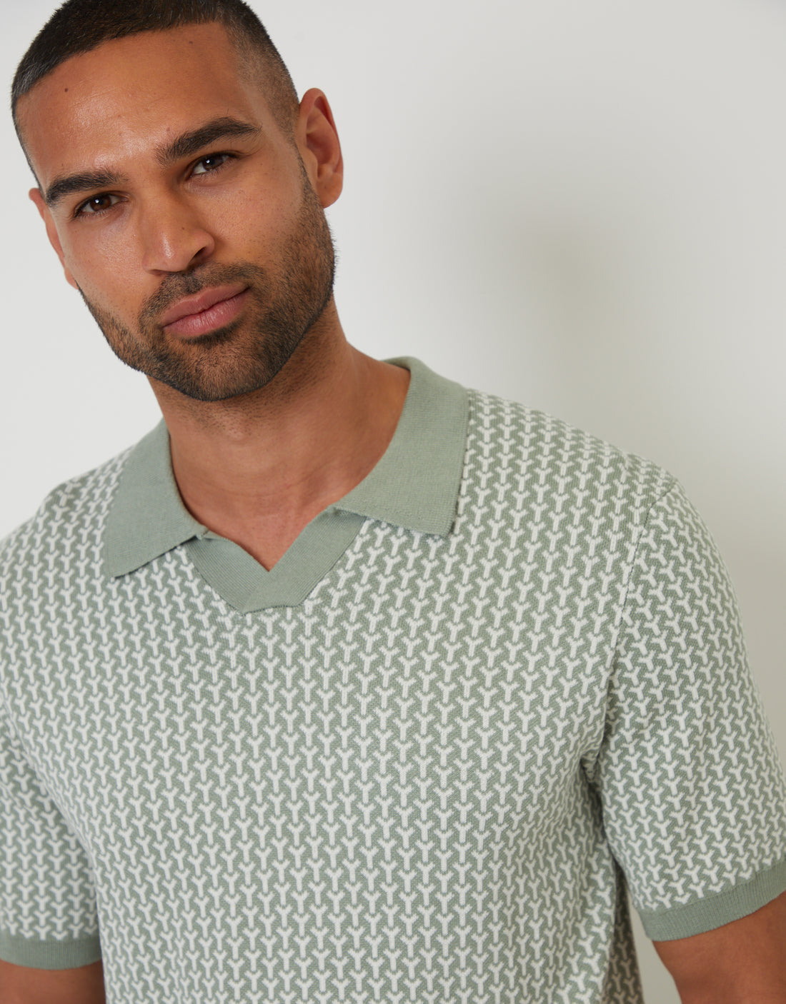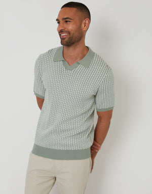 Sage Green Jacquard Geo Trophy Neck Knitted Polo