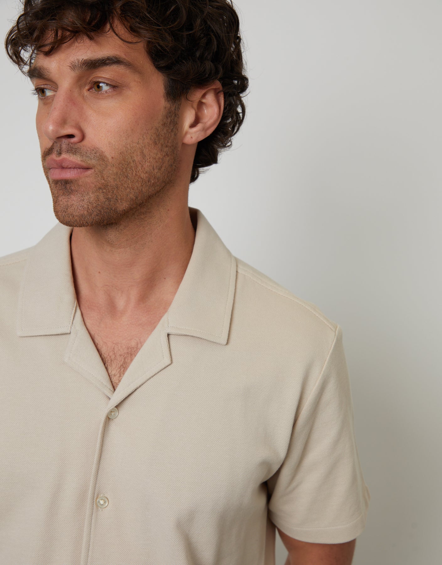 Crafted with a from a soft cotton jersey pique, this shirt features a revere collar with single needle stitching and a button-through fastening. The short sleeves and side split vents offer comfort and breathability for warm days. Complete with a back yoke seam for added detail, this shirt is perfect for casual outings or beachside gatherings.