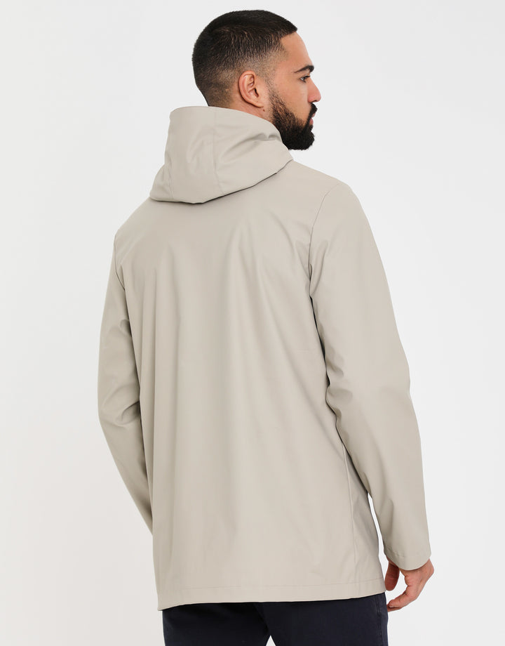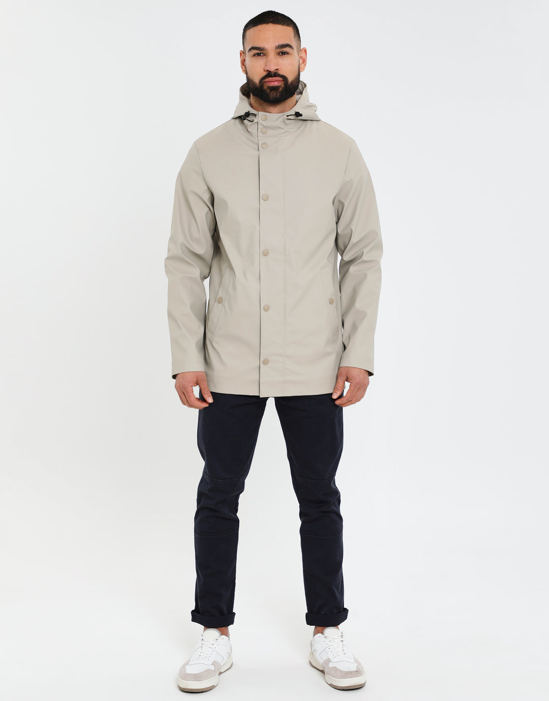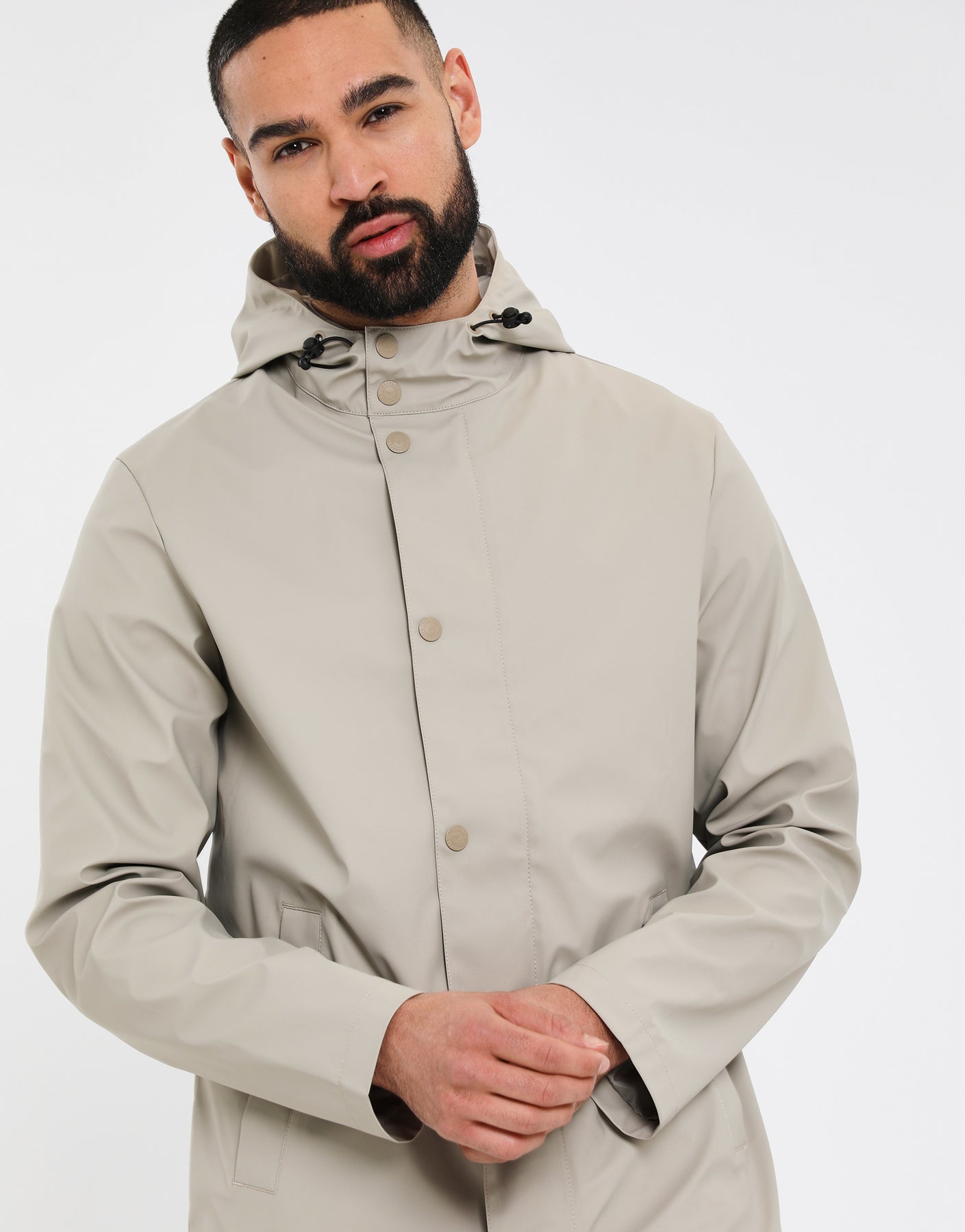 With hood and simple slimline look, this mac style coat has a concealed zip fastening with snap fasteners to the placket and two pockets to rest your hands.