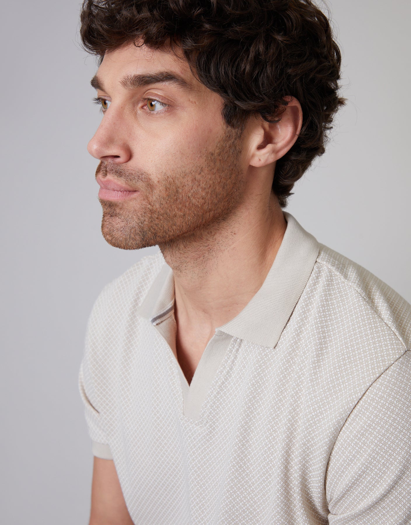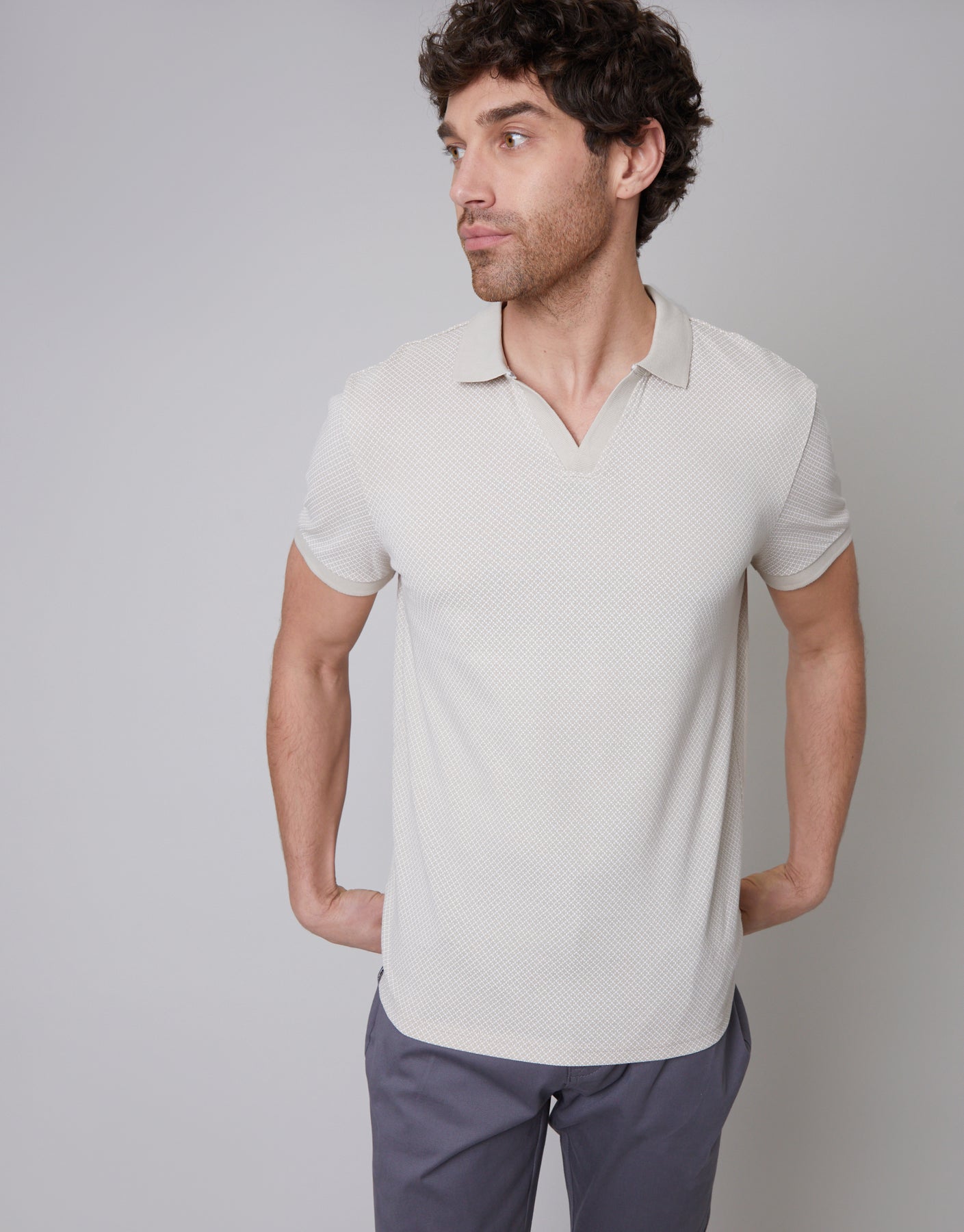 Cut in a regular fit, this staple polo shirt has an all over print and a trophy shape open neck ribbed collar.