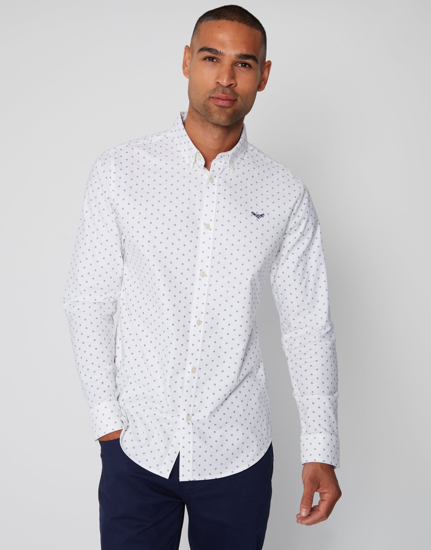 This classic cotton blend shirt with long sleeves features a button down collar and button cuffs. In white with a navy blue geometric print, this regular fit shirt will look fresh with jeans and can be made smarter for an evening out.
