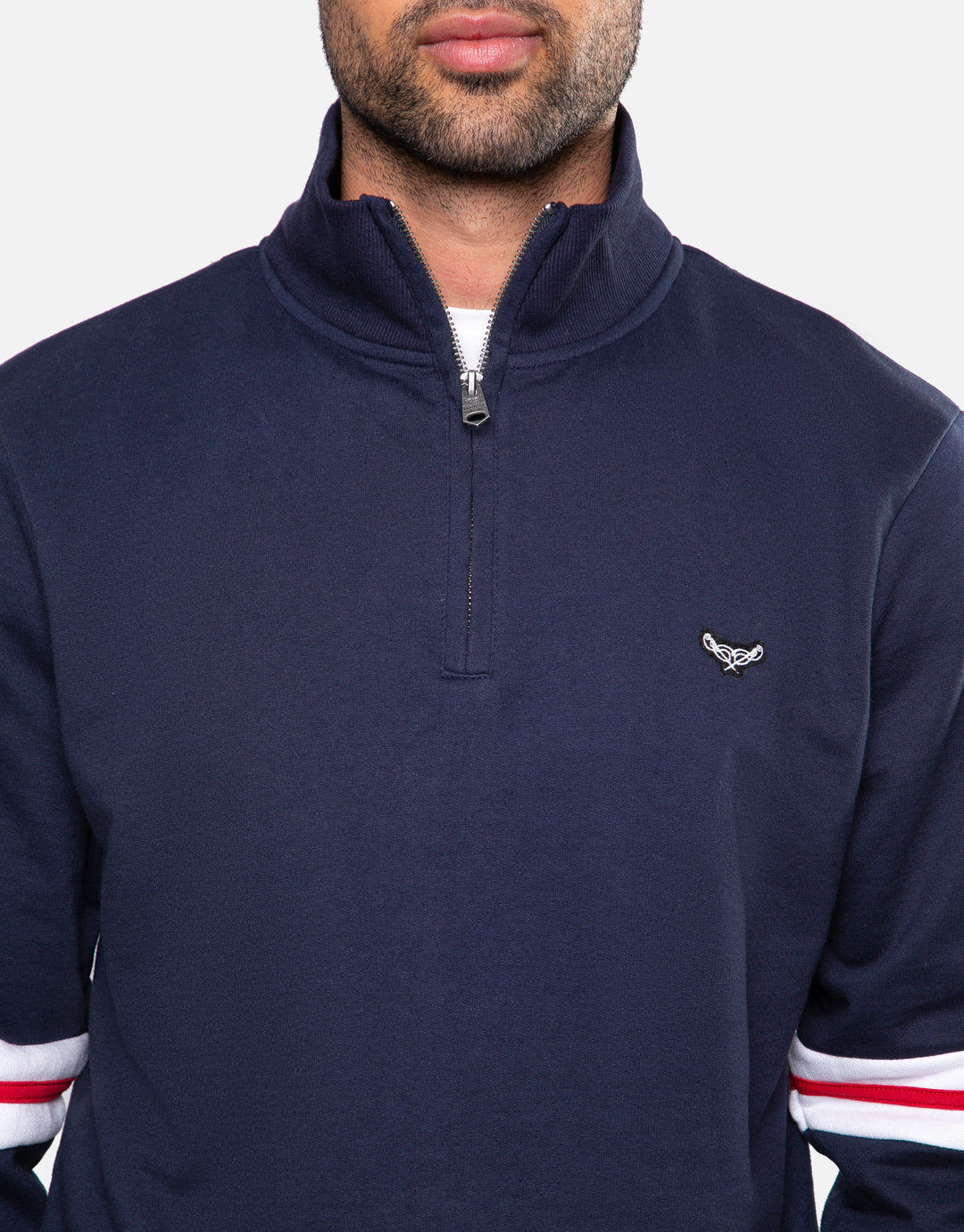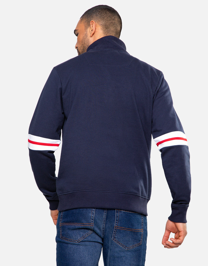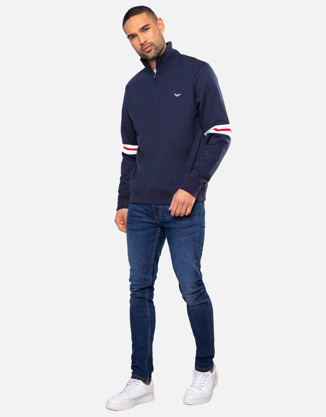 In a fleece knit and cut in a regular fit, this fleece jumper has a quarter zip funnel neck making it an easy throw-on piece. Funnel neck, ribbed cuffs and hem will keep you snug. Stylish contrast stripes around the elbow to give off a sporty vibe. Finished with our Threadbare embroidery on the chest for brand recognition.