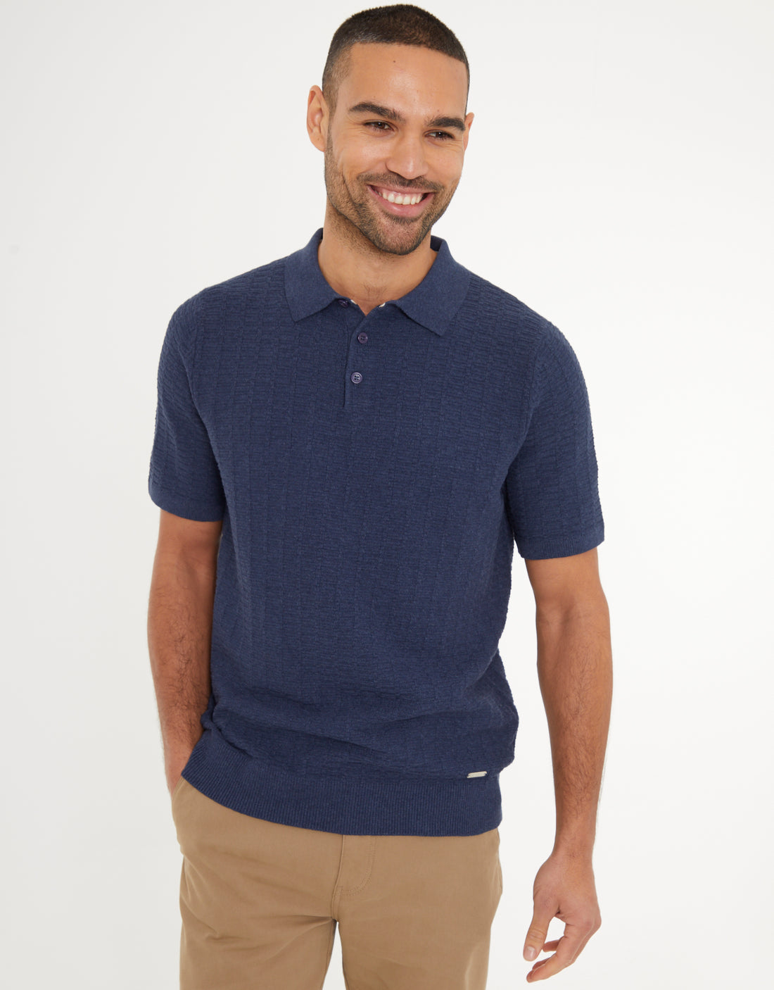 With an open collar fashioned with button up detail, this short sleeve knitted polo has small ribbed cuffs to the sleeve and a ribbed hem for comfort and ease.