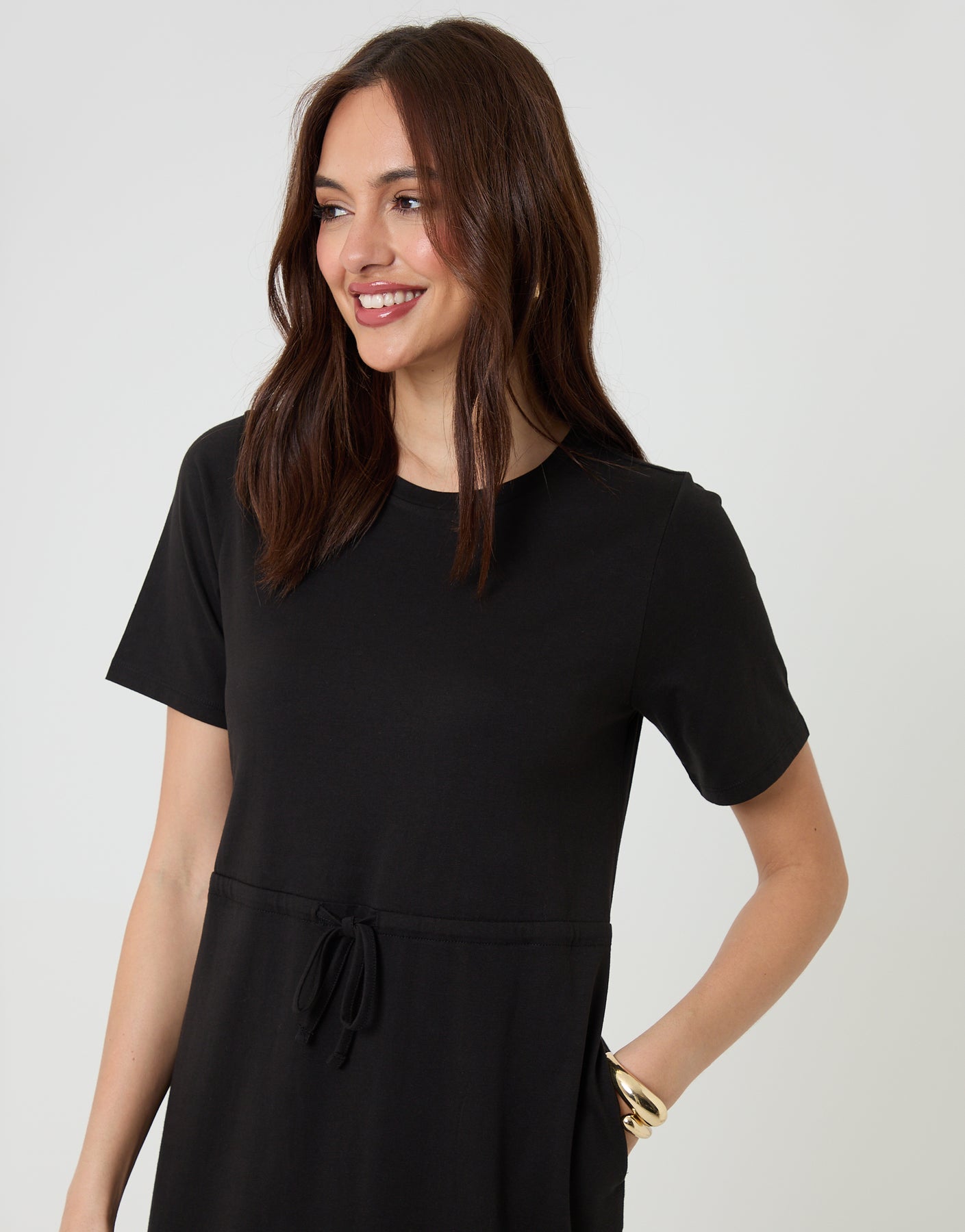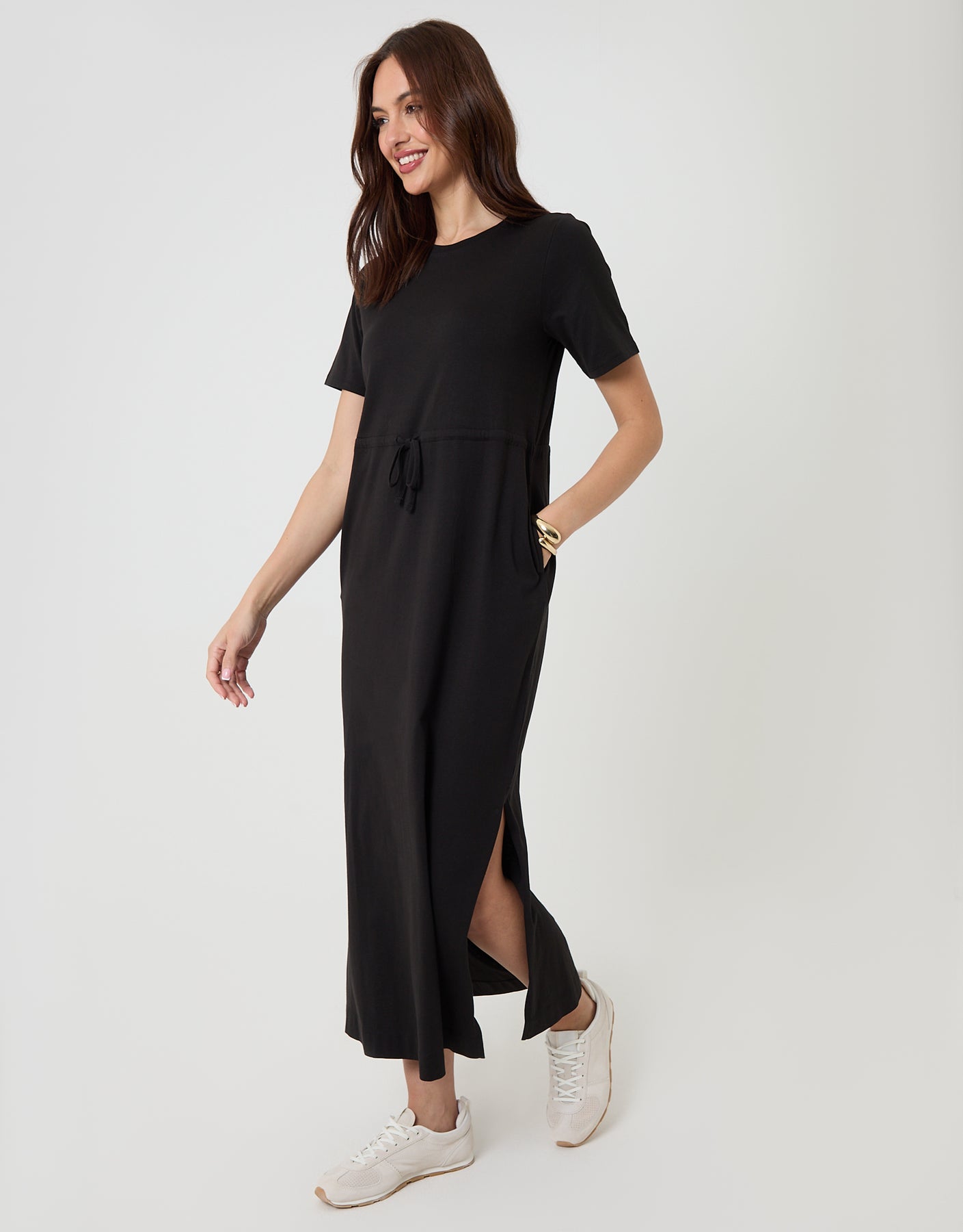 Black Drawstring Waist Side Split Cotton Jersey Midi Dress