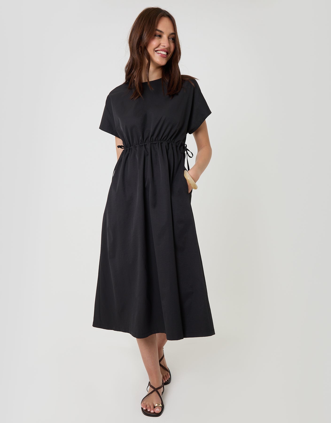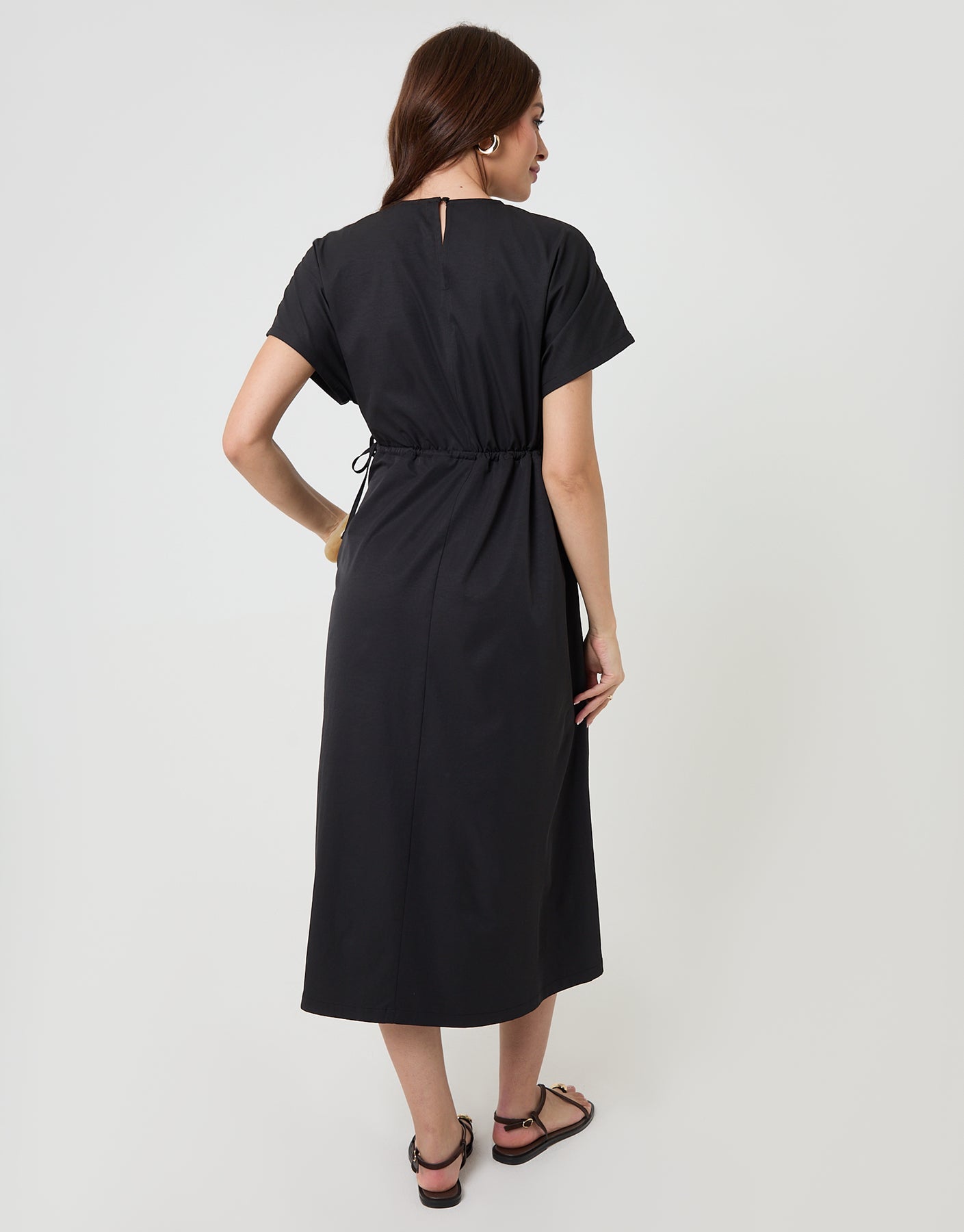 Black Kimono Sleeve Drawstring Waist Midi Dress