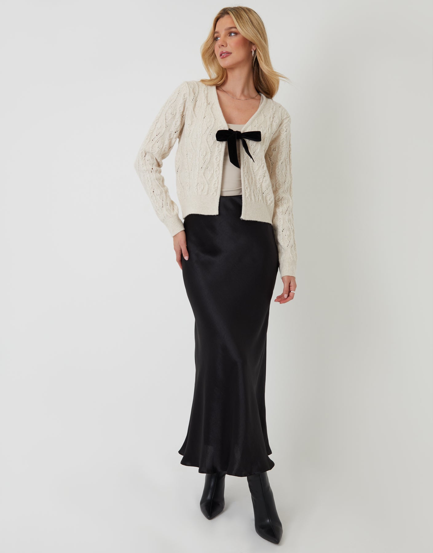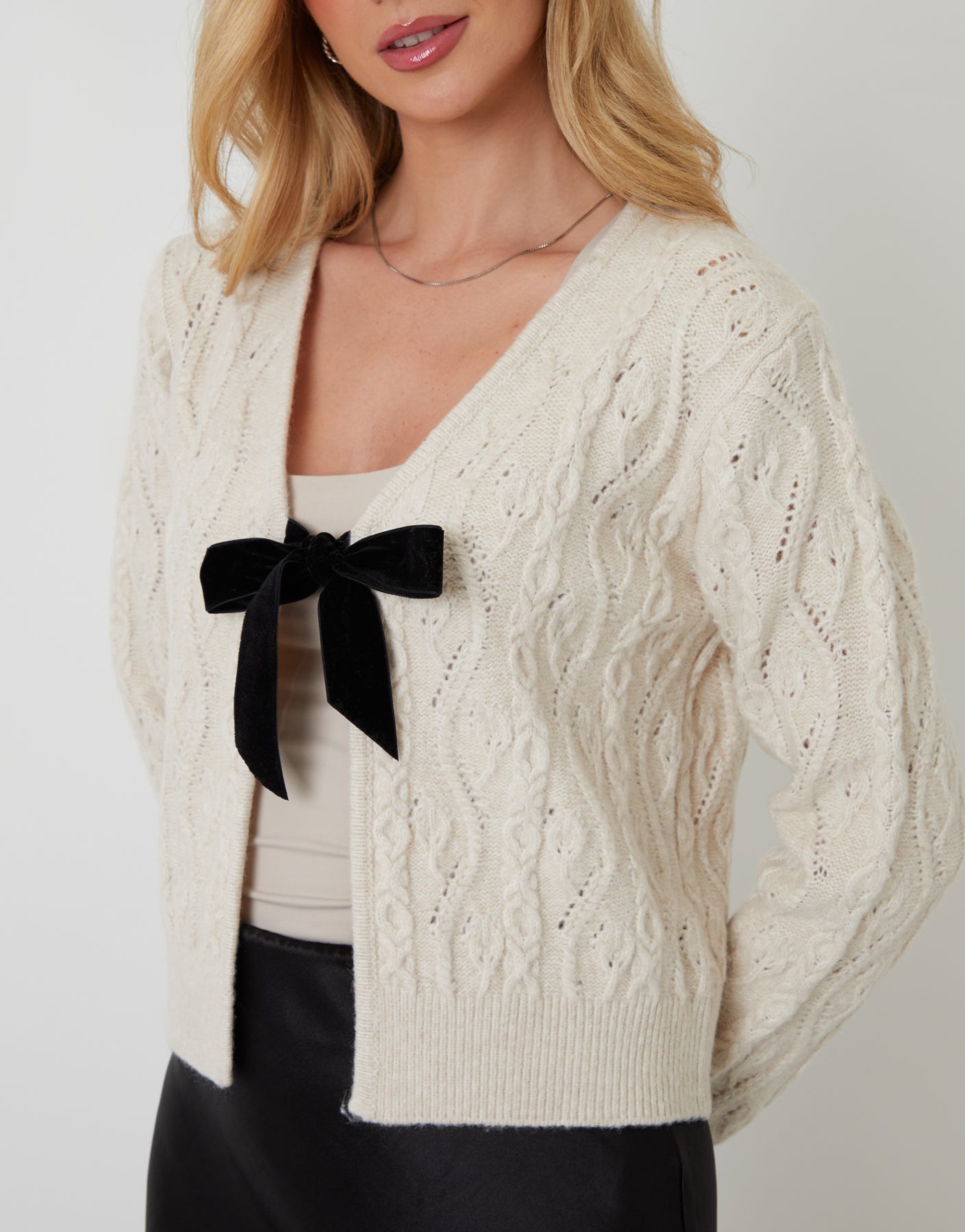 Cream Cable Knit Velvet Bow Detail Cardigan