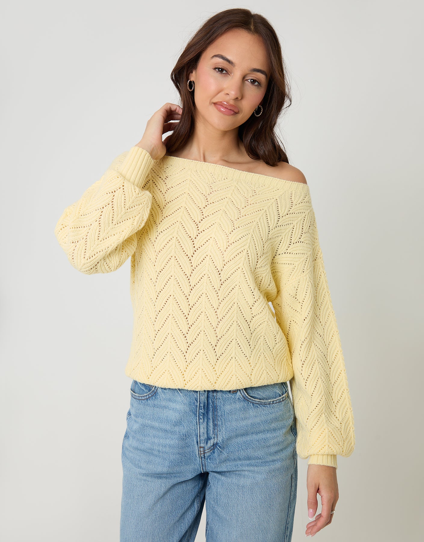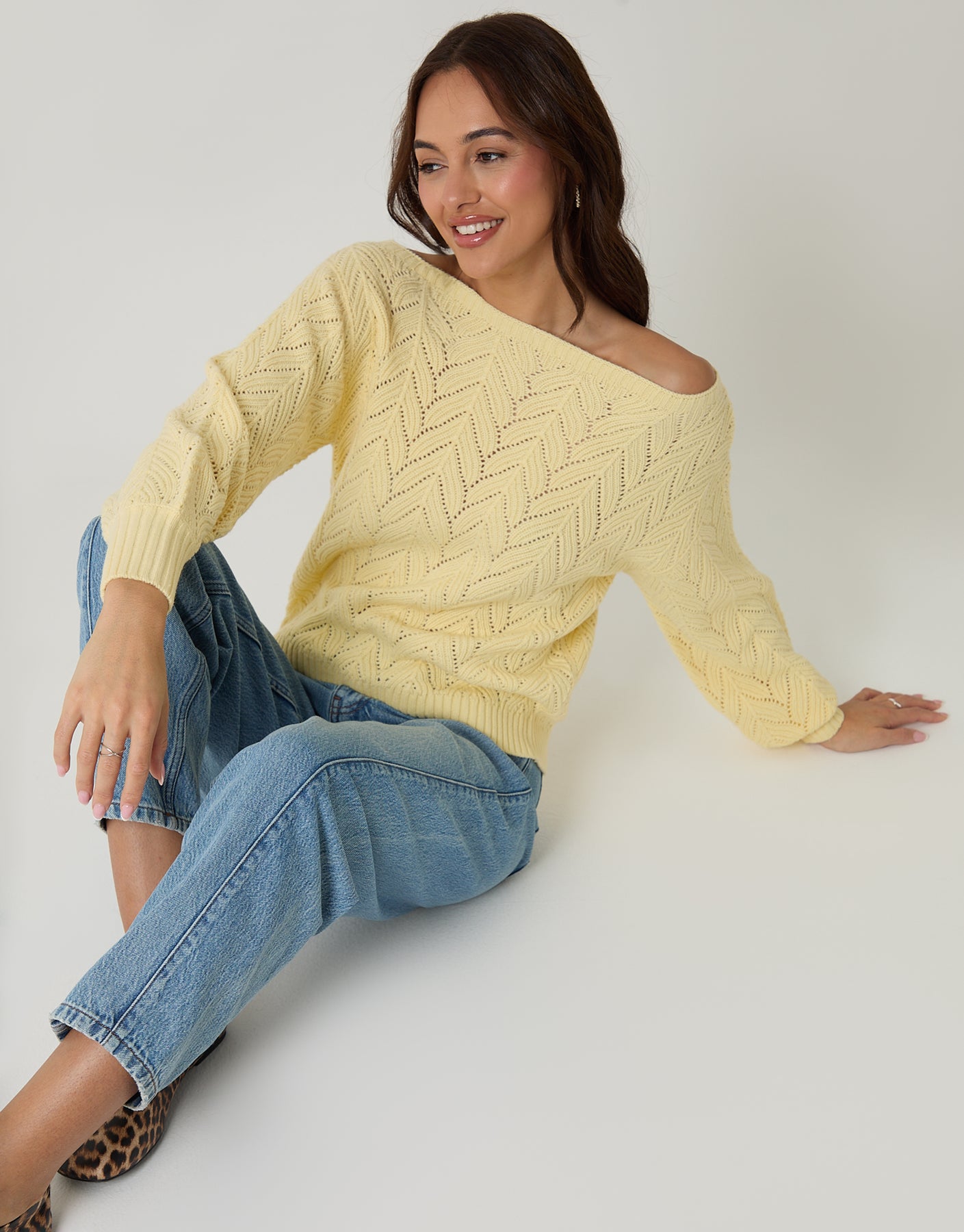 Lemon Yellow Pointelle Knit Slash Neck Jumper