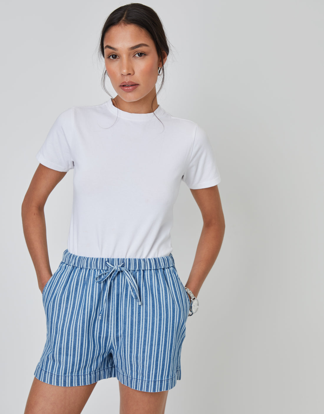 Pair with a simple white crew neck t-shirt and sandals for a holiday-ready look.
