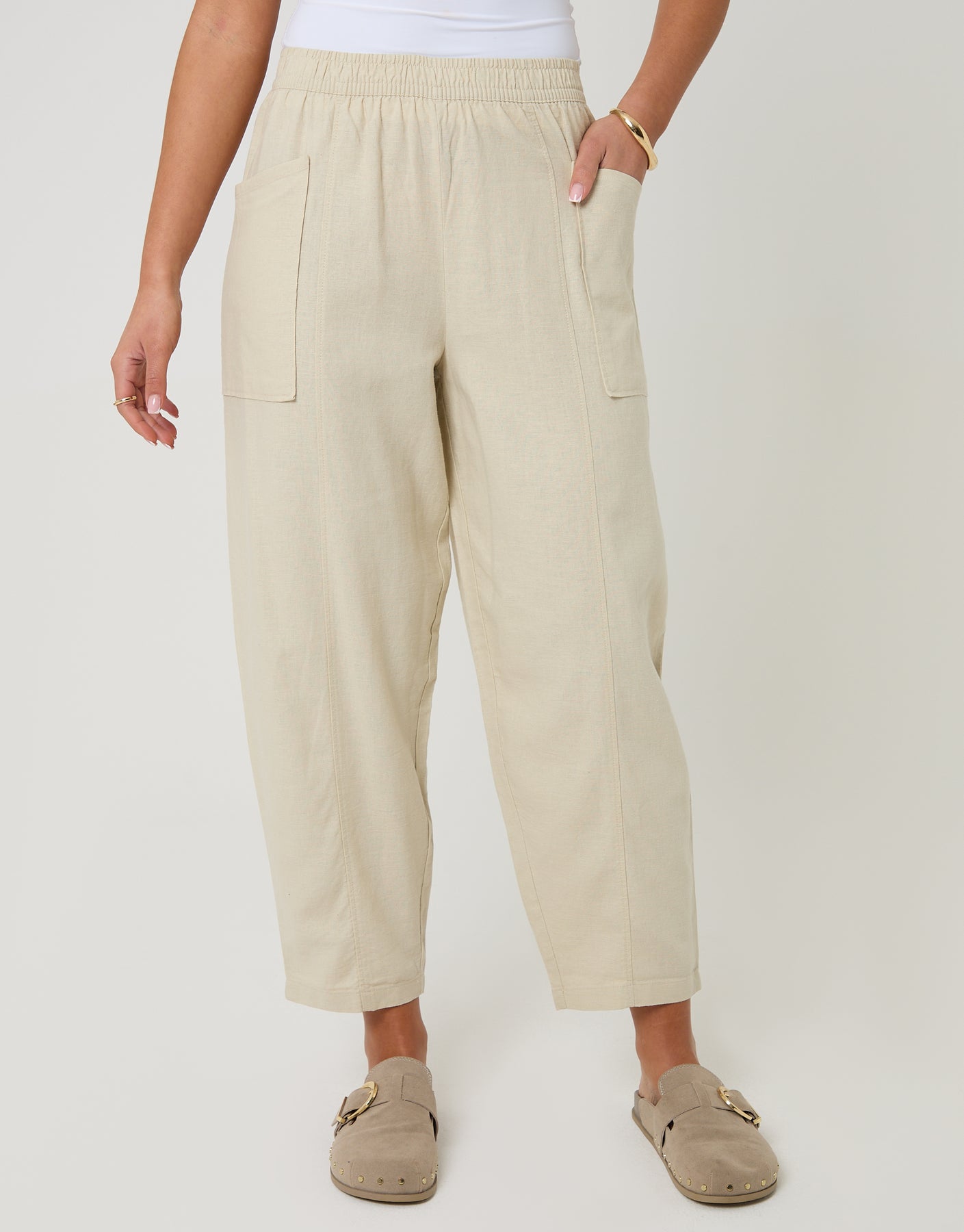 Stone Linen Blend Pocket Detail Barrel Leg Trousers