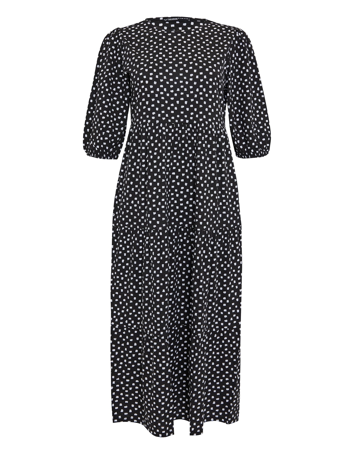 This monochrome black and white abstract polka dot print longline dress in a loose fit has a round crew neck, smock style waist with tiers adding stylish and simple volume. Complete with relaxed short sleeve puff sleeves that are elbow length for easy styling, this pullover tiered dress is gathered at each seam for a fashion-forward ruched effect.