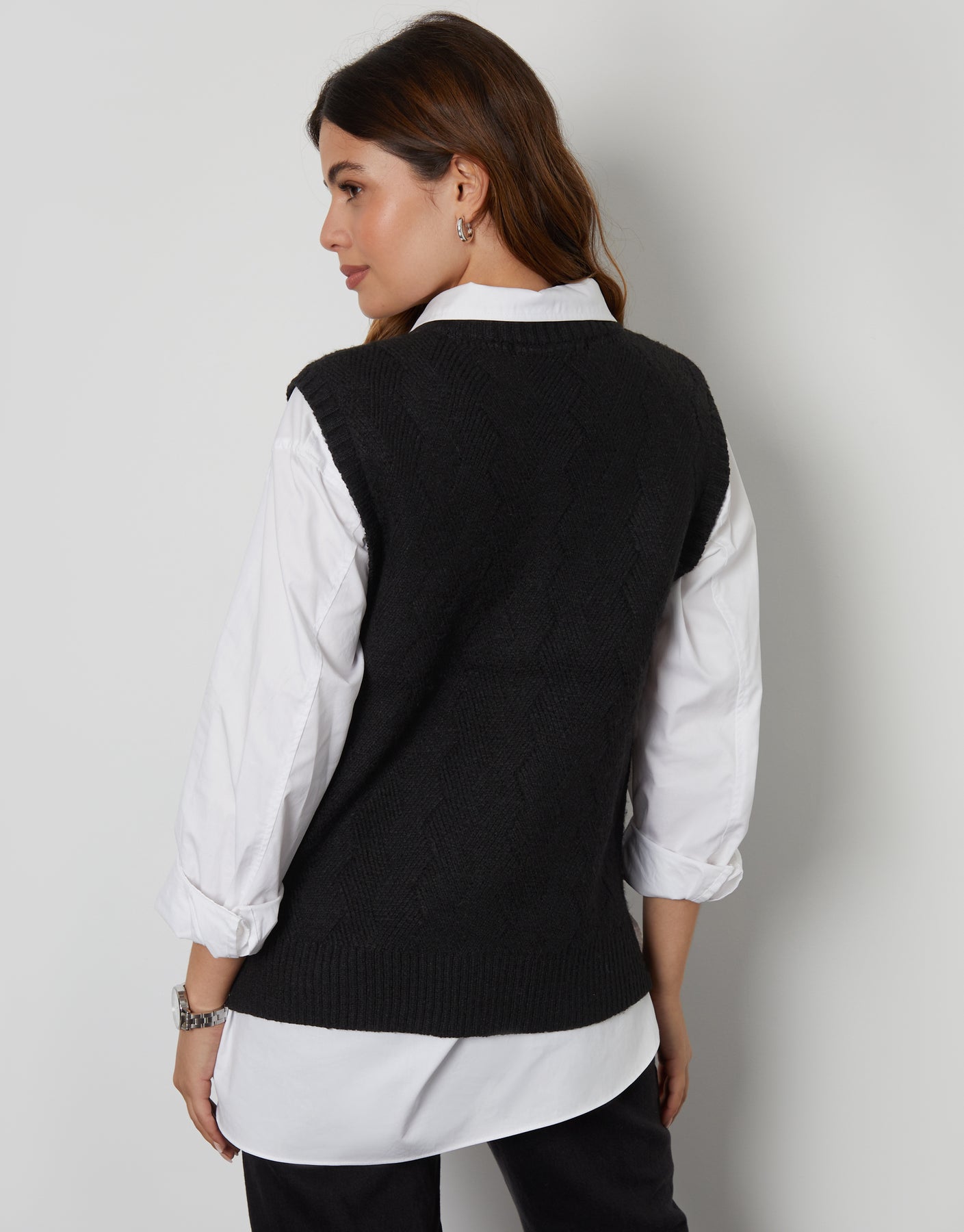 With ribbed detailing at neck and hem and chevron stitch detailing to body, this sleeveless style will never date. This tank top is made from a soft acrylic and polyester blend fabric to keep you super comfy.