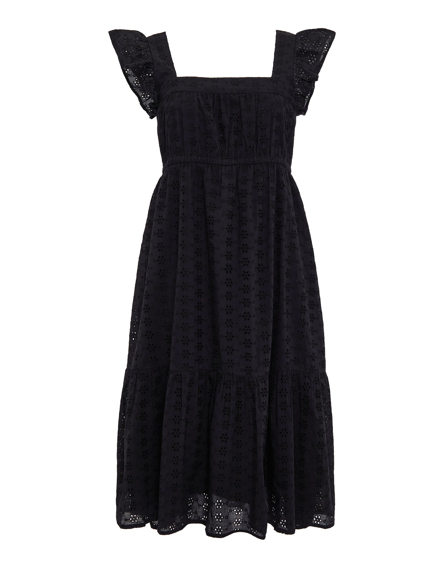 Black Broderie Anglaise Frill Sleeve Tiered Midi Smock Dress