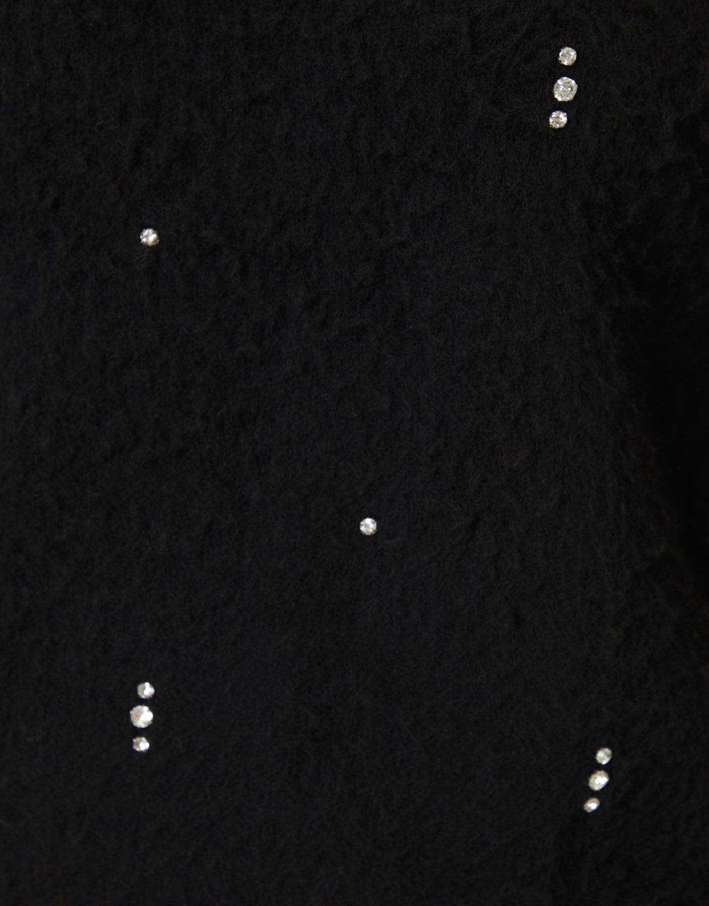 Soft and fluffy with a brushed finish, it features a ribbed crew neck, cuffs, and hem for a snug fit. The front and arms are affixed with diamante gem embellishments, making this cosy jumper both chic and comfortable.