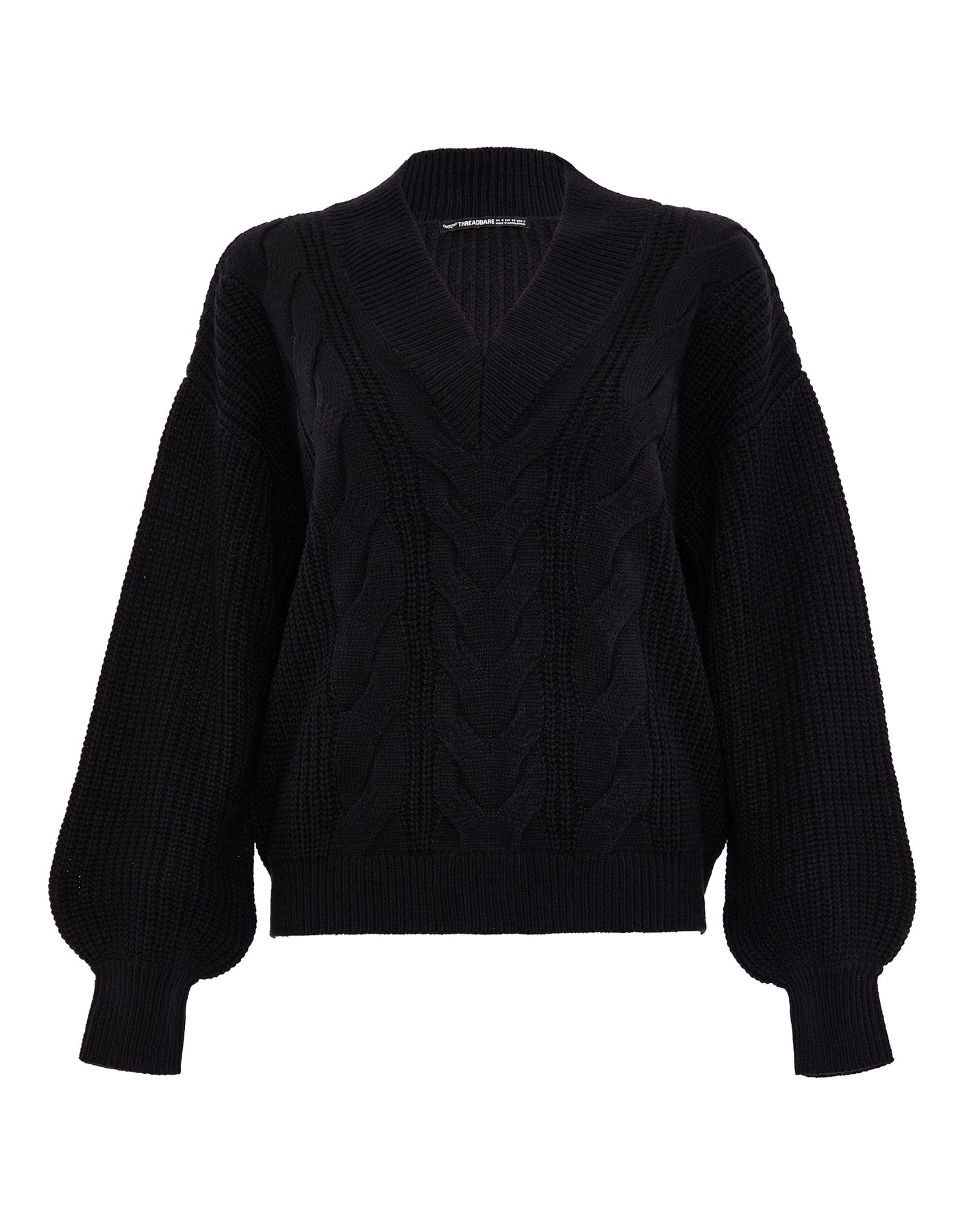 This knit has a cable knit design to the front and a ribbed V neck, along with a relaxed drop shoulder and ribbed cuffs creating a slouchy-feel balloon sleeve.