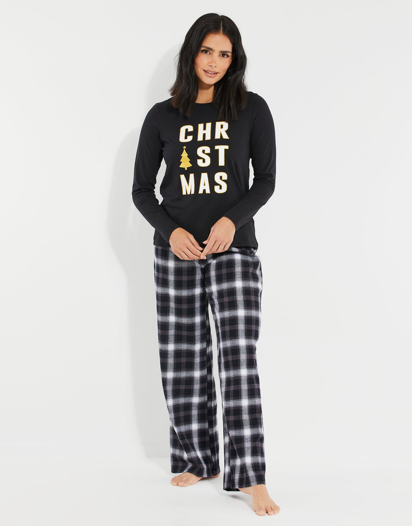 This set features a long sleeve black top with "Christmas" text in gold foil with Christmas tree graphic and ribbed cuffs and hem for comfort and long pants in black and white check print with an elasticated waistband and drawcords.
