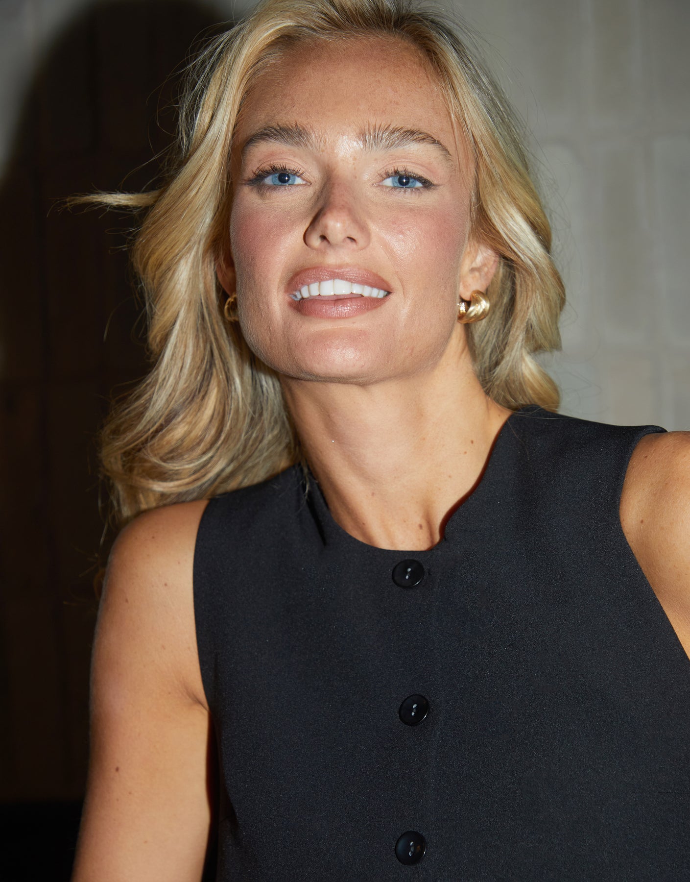 With a round crew neck, this waistcoat has two front welt pockets and a button up front with a split front hem. Finished with bust darts and a centre back seam for a tailored feel.