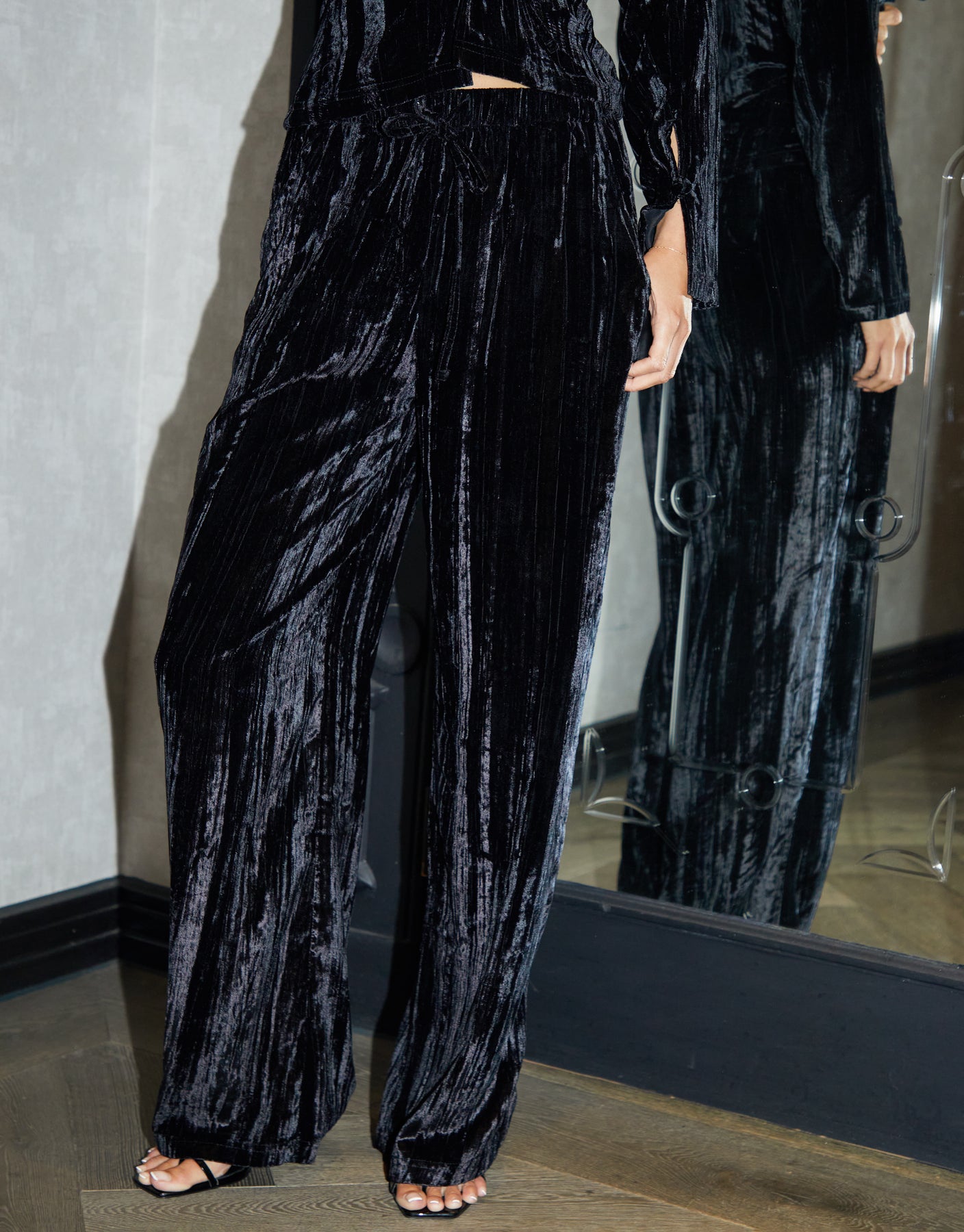 Black Crinkle Velvet Wide Leg Trousers