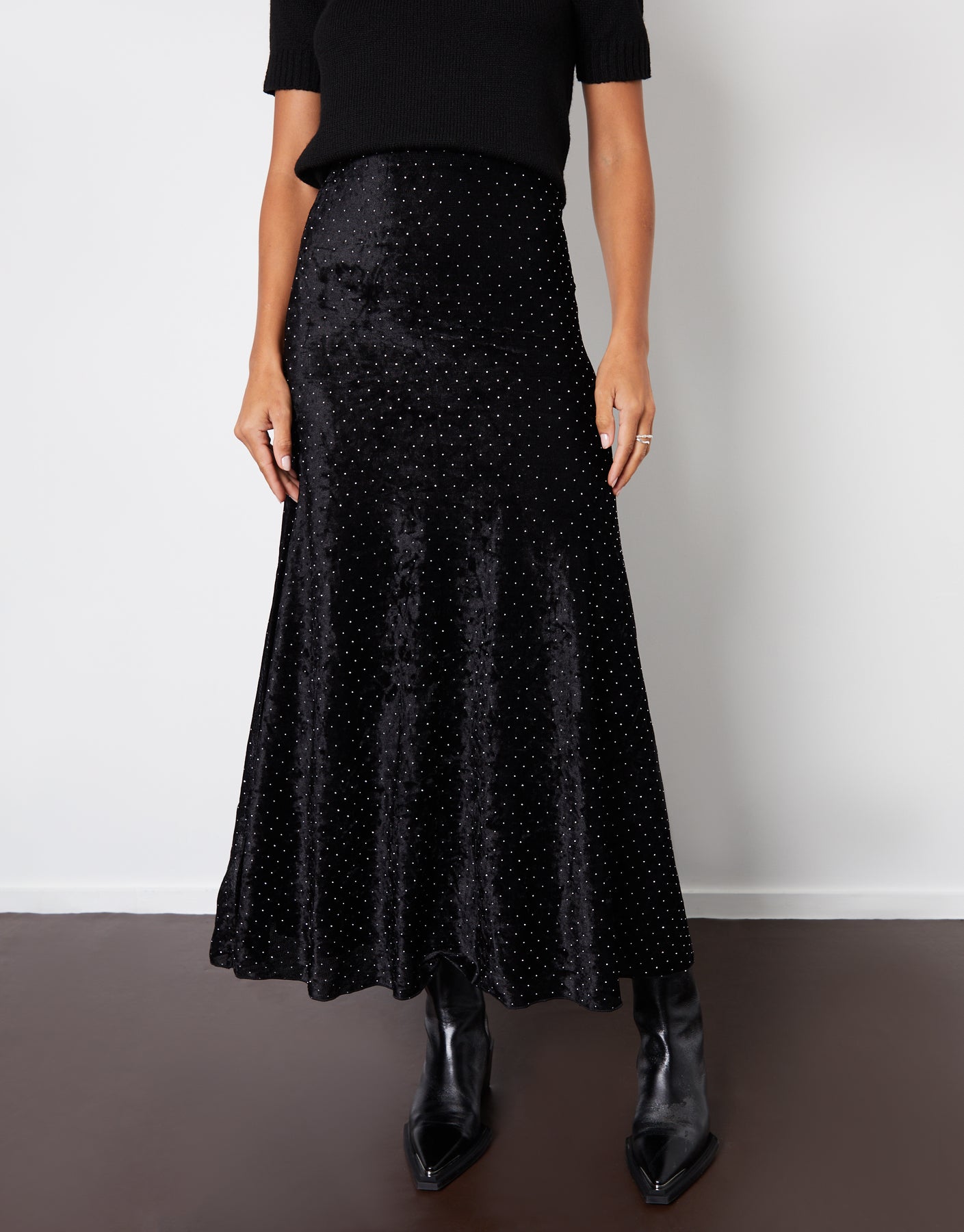 Cut in a maxi length with an elasticated waistband for easy wear, this slip skirt drapes nicely towards the flared hem for a flattering fit that accentuates the feminine form. Made from a soft mesh velvet and fully lined to ensure comfort and coverage, it's embellished with diamante gems for a sparkly finish.