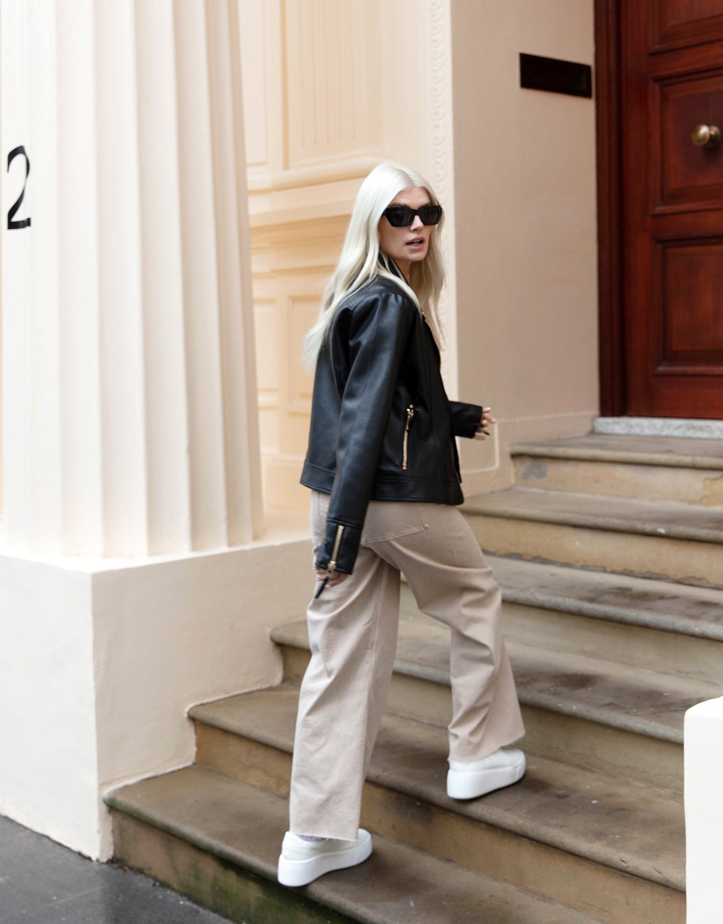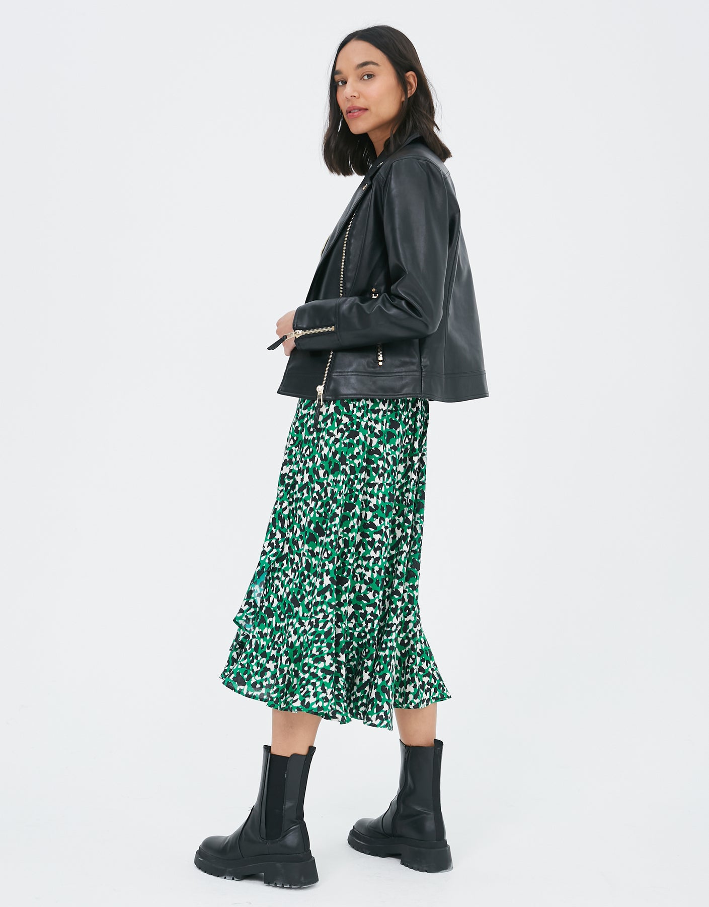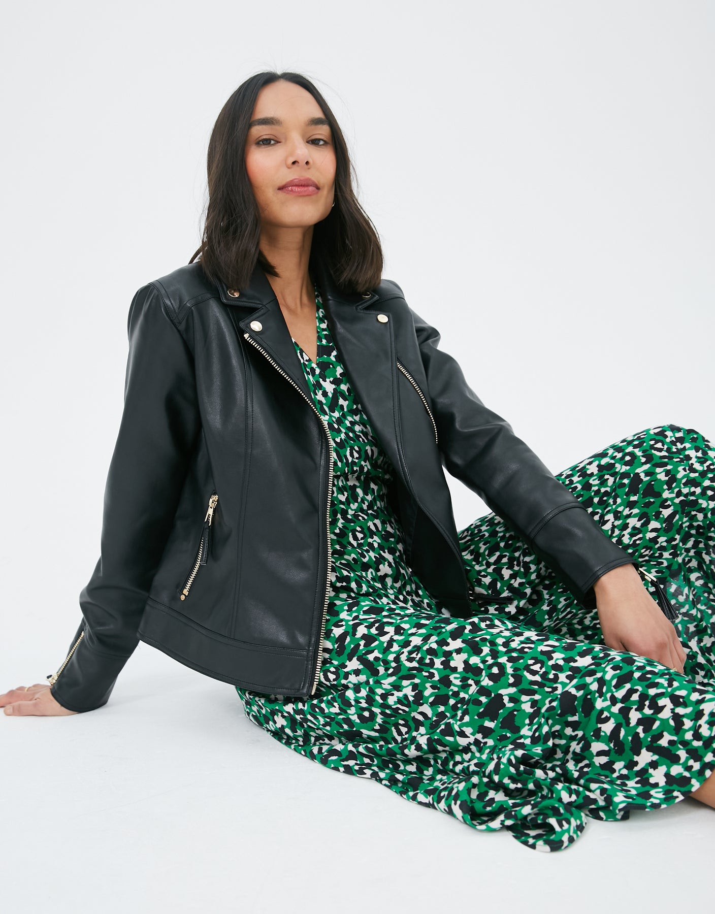 In a biker style, this faux leather jacket is cut in a classic shape so it suits all shapes and still flatters in all the right places for that structured feminine form.