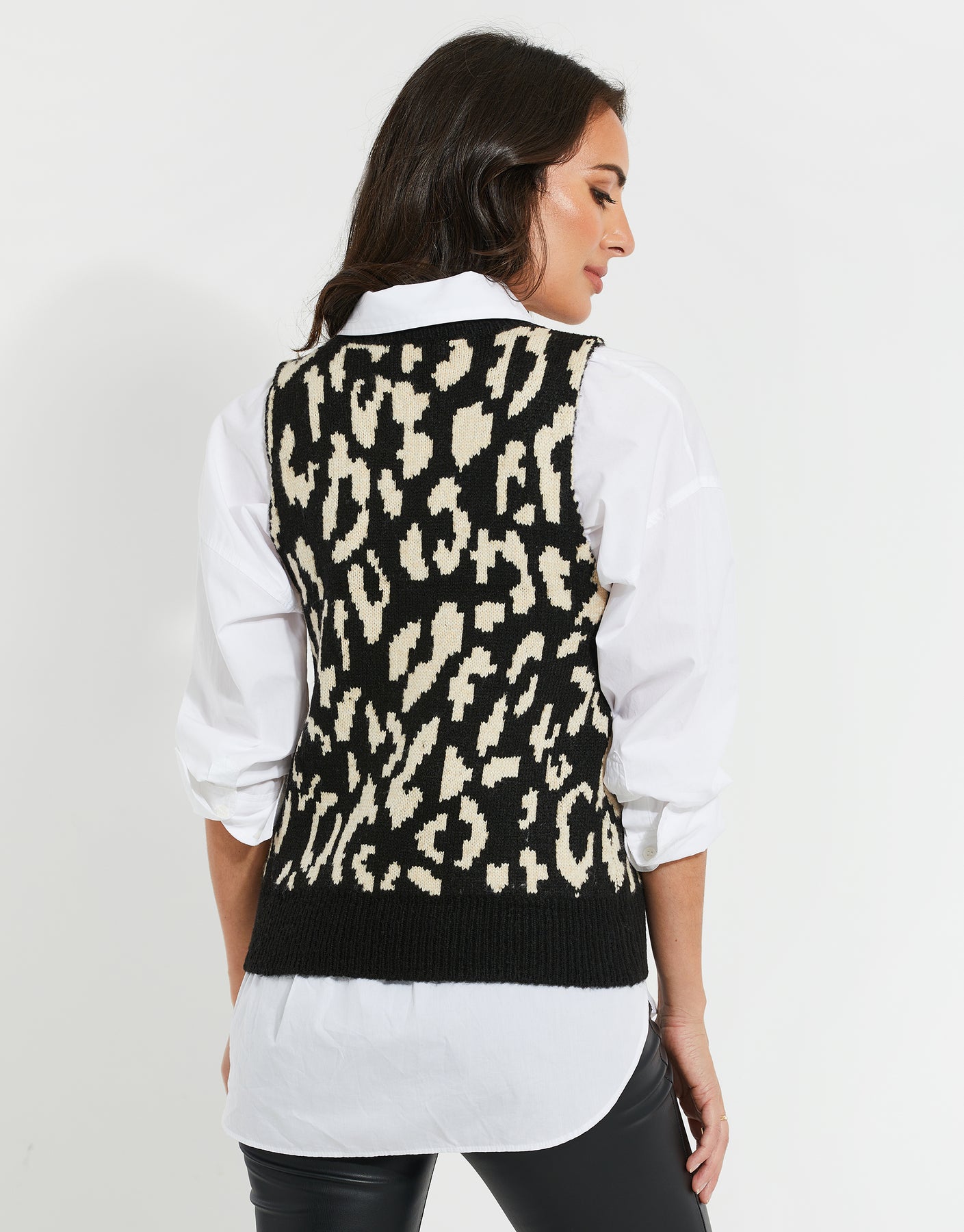 Keep it cool in our crew neck knitted vest in a gorgeous leopard print, a season must-have.