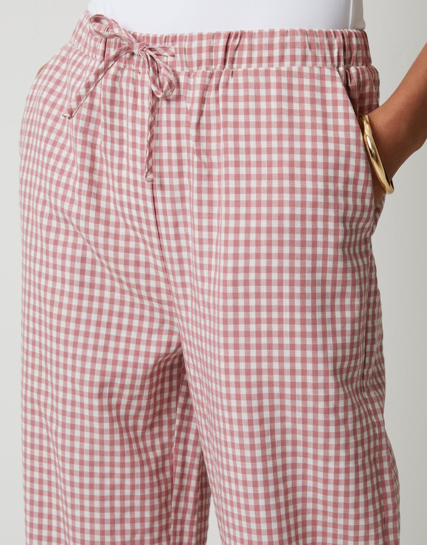 Cut in a wide leg fit, these gingham check trousers have an elasticated waistband with drawcords ensuring a comfortable fit and easy pull-on styling. With two side pockets for a practical touch, and finished mock back welt pockets give a tailored feel.