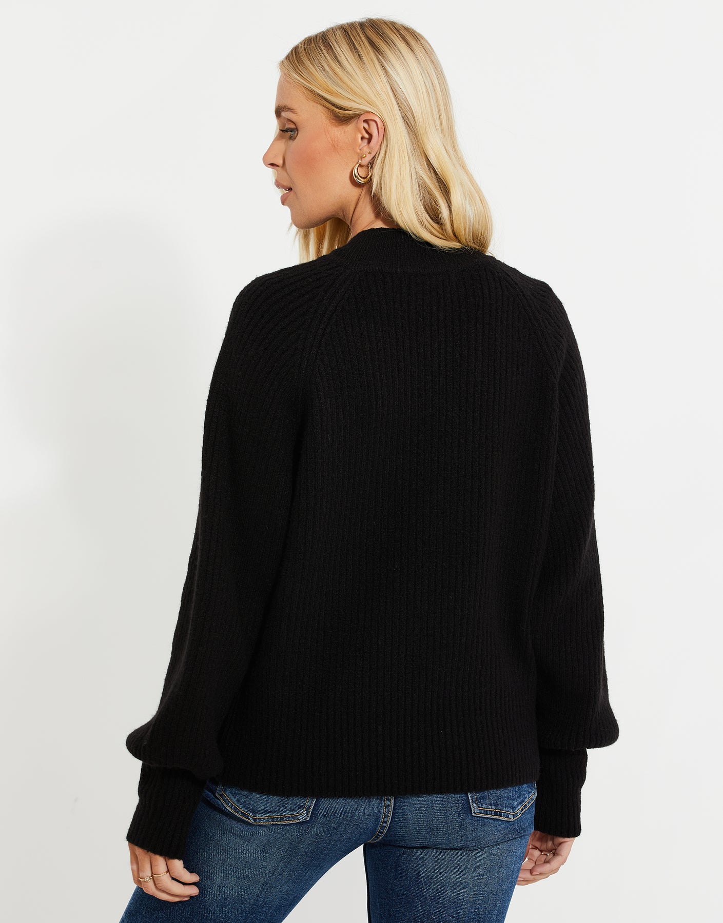 This knit has a ribbed design, along with a grown-on high neck, and relaxed raglan sleeves that are finished with large ribbed cuffs for a balloon-style sleeve. Finished with a ribbed hem to keep the easy-to-wear feel.
