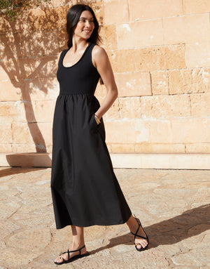 Black Sleeveless Rib Jersey 2-in-1 Midi Dress with Poplin Skirt