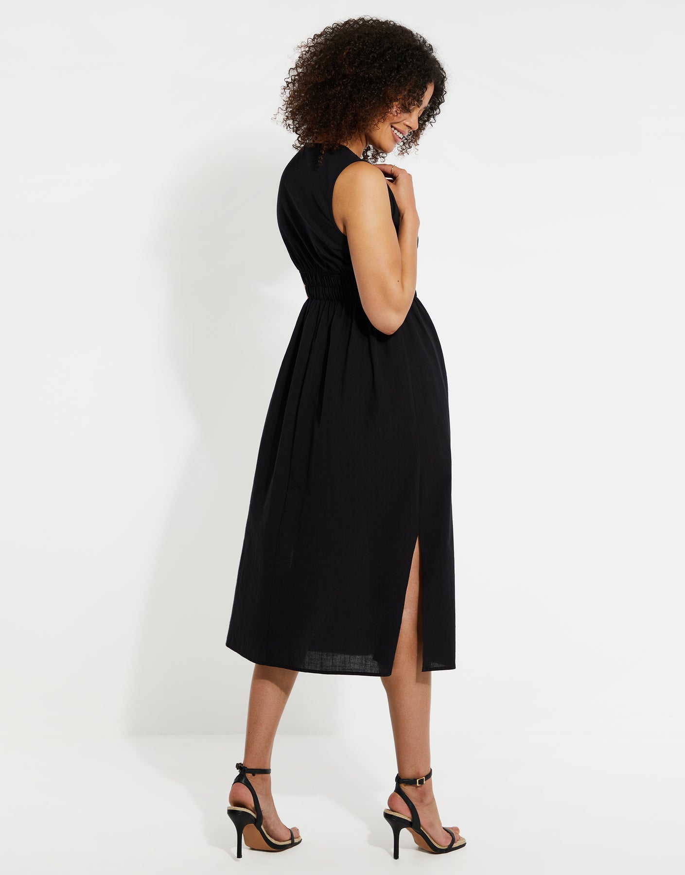 With a ruched, cinched in waist and deep V-neck, this midi dress has fullness in the skirt and a ruching effect on the shoulders for elevated detail.