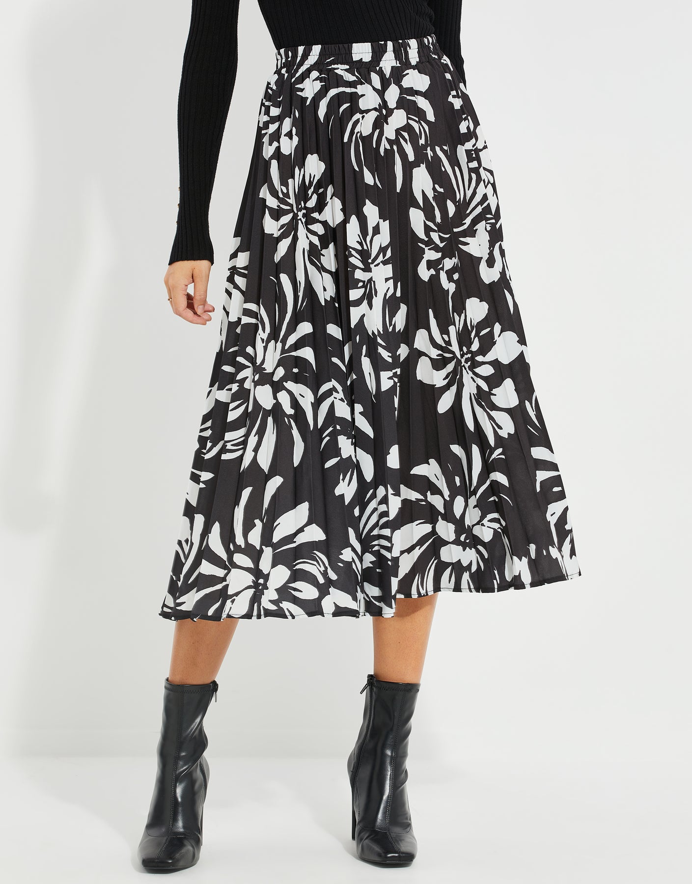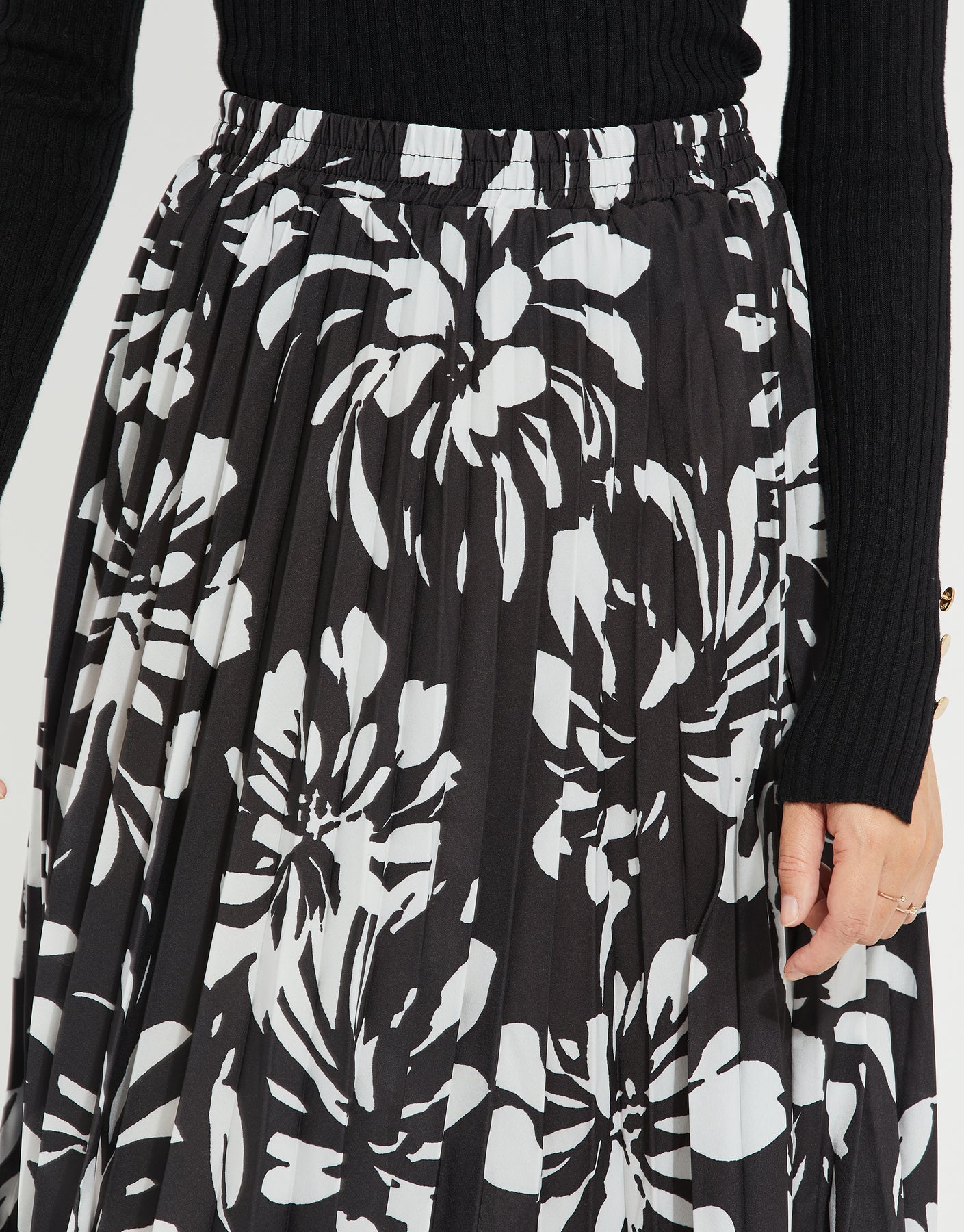 In a gorgeous black and white print, this A-line midi skirt is finished with a fully pleated skirt and a flat waistband.
