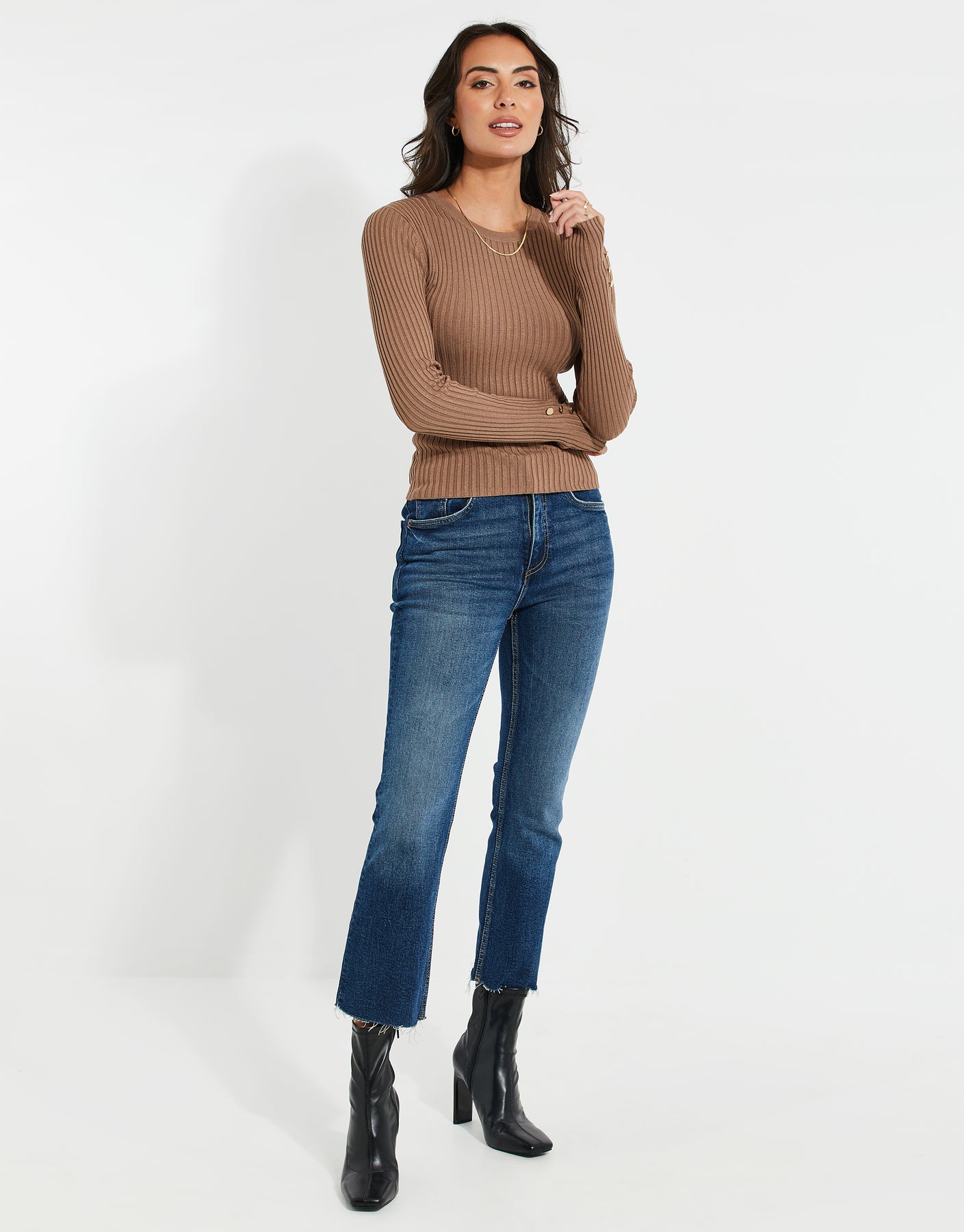 With an all-over rib and ribbed neckline, it’s more stylish than a basic knit but is still simple enough for a pared-back look. In a camel brown, it’s easy to style and will keep you snug when you need it.