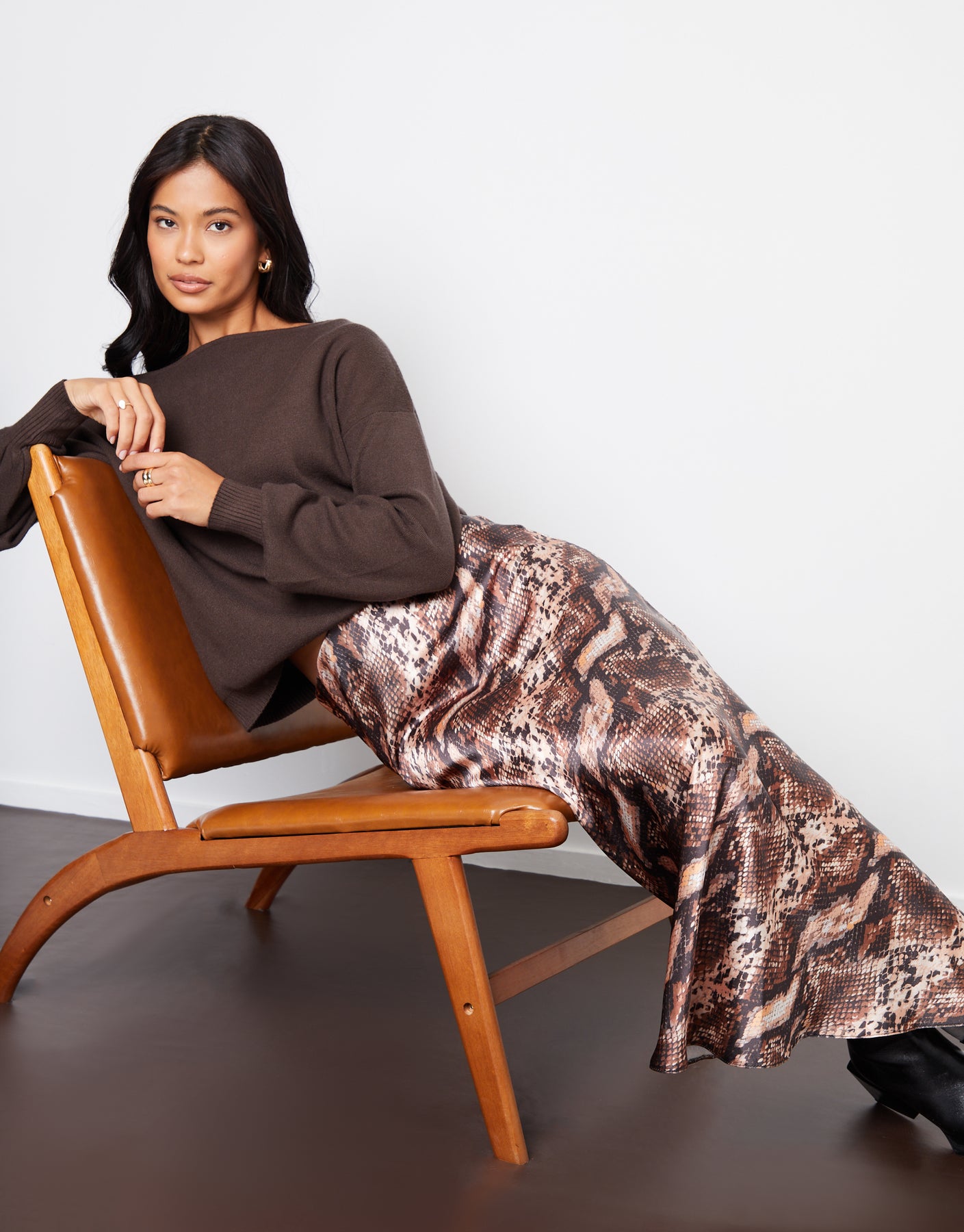 A simple yet staple piece, this snake print satin maxi skirt is an absolute must-have for outfit building that feels contemporary yet practical.