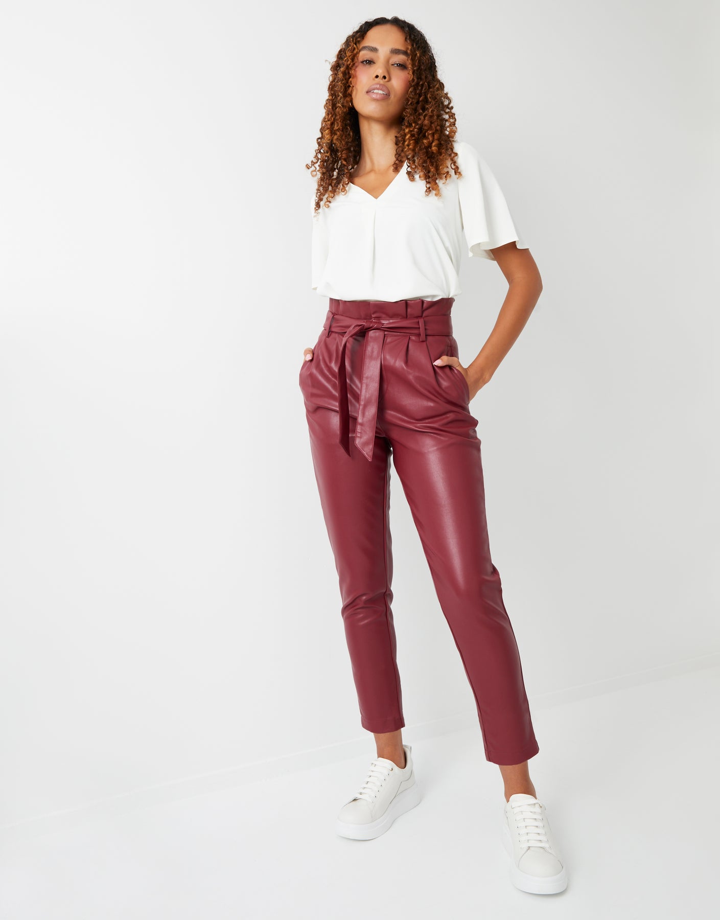 Burgundy Paperbag Tie Waist Faux Leather PU Trousers