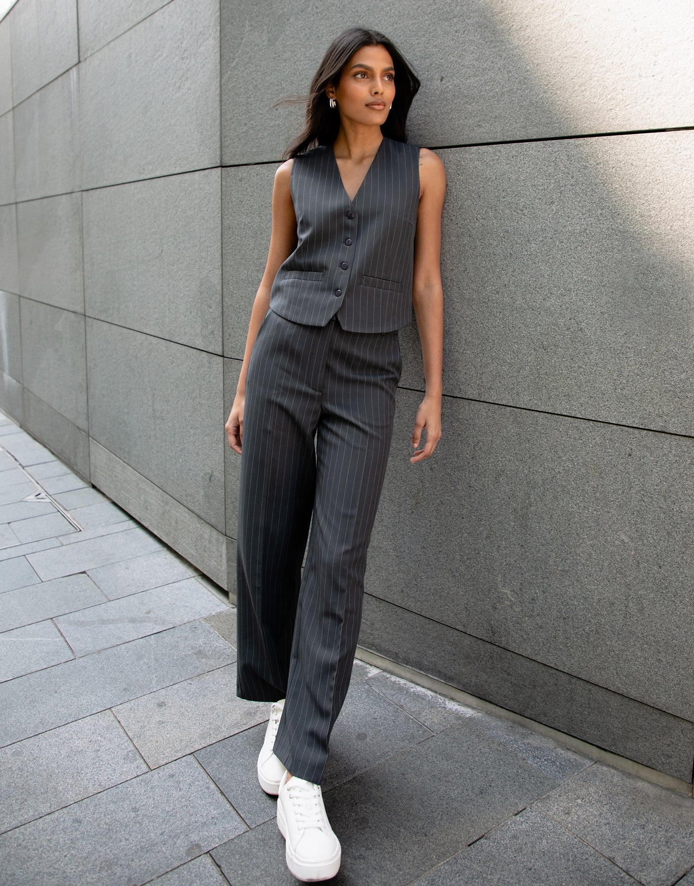 Level up your wardrobe essentials with these charcoal grey wide leg pinstripe trousers, perfect to hit the soft tailoring trend that's everywhere this year.