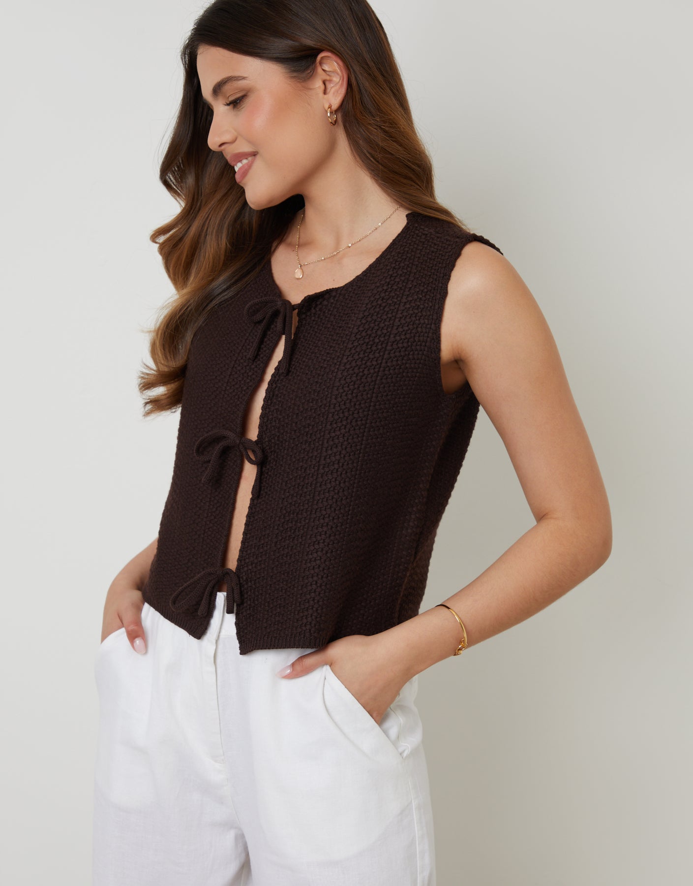 Crafted from a soft textured knit, this lightweight sleeveless vest features a flattering round neck and fastens with three ties at the front for a stylish finish.