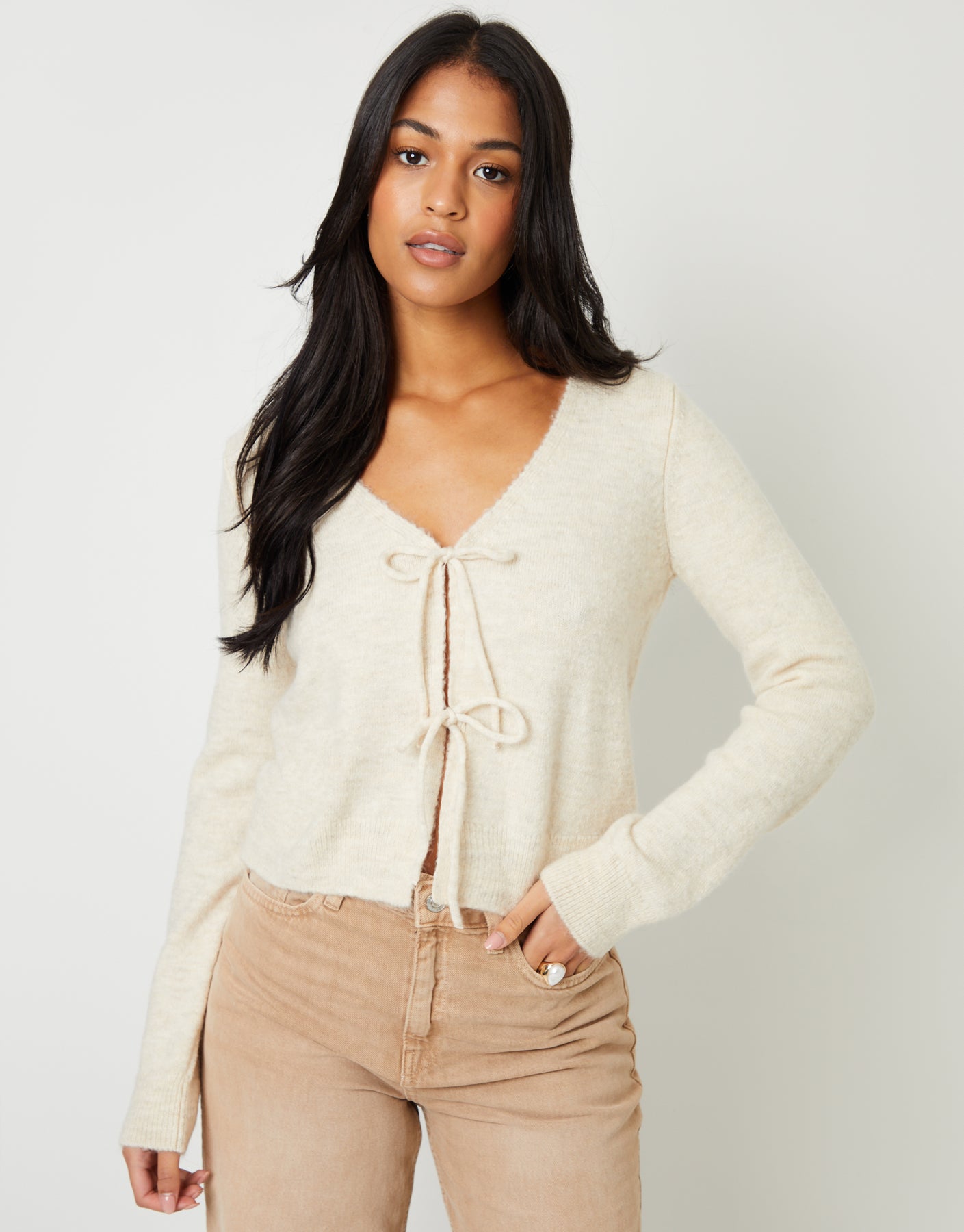 Featuring a flattering V-neck with a piped edge, this cardigan in a jersey stitch has set-in sleeves and double bow tie front fastening for a feminine touch, and the ribbed hem and cuffs offer a snug fit.