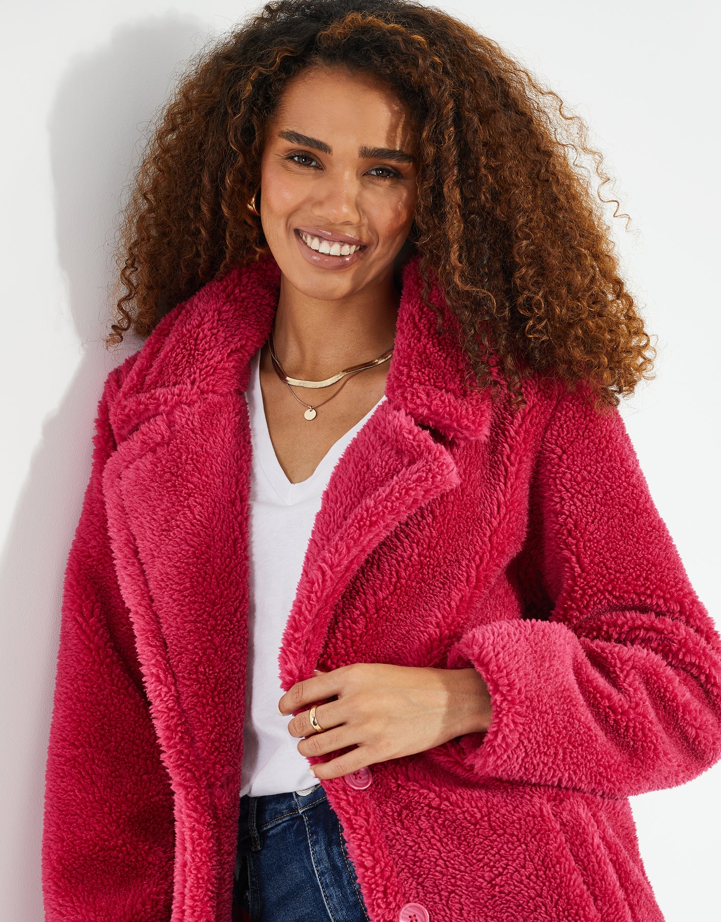 In faux borg fabric that’s soft to the touch, the fuzzy look is perfect for autumn and winter. Button up or wear open, this jacket in vibrant fuchsia pink gives you the freedom to express your style, your way.