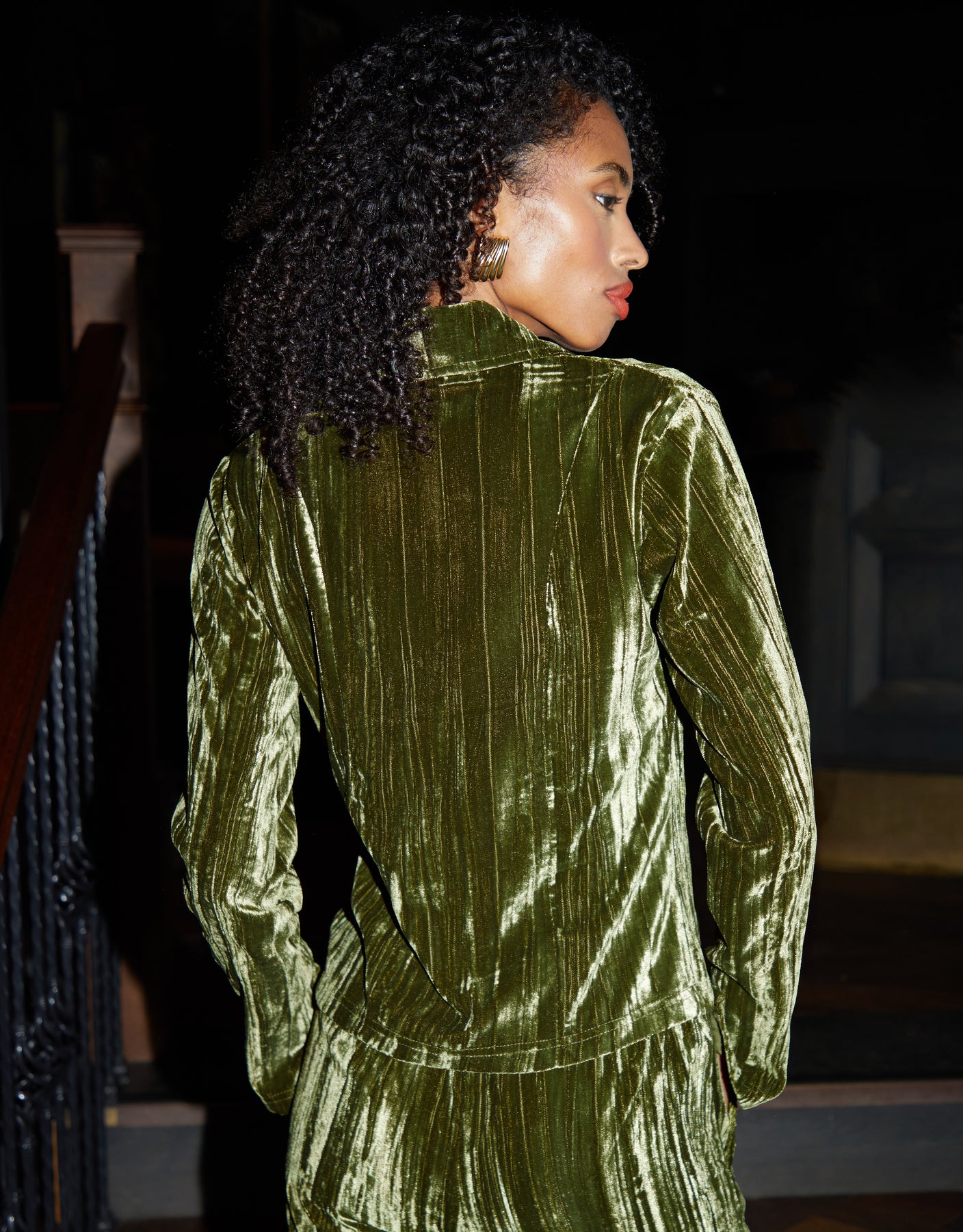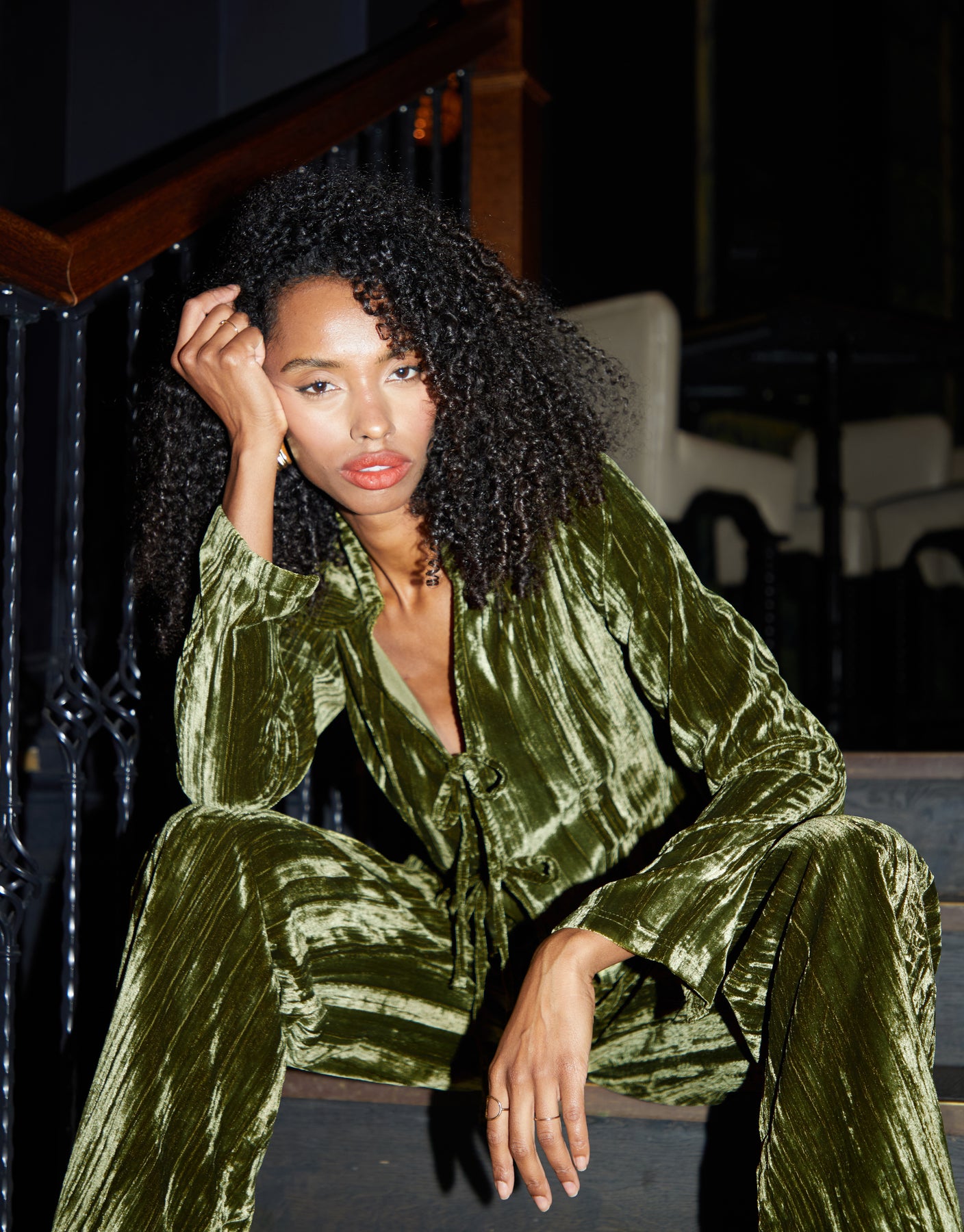 Perfect for parties, it pairs beautifully with the matching trousers for a full velvet co-ord, or alternatively wear with our black satin slip maxi skirt and pumps.