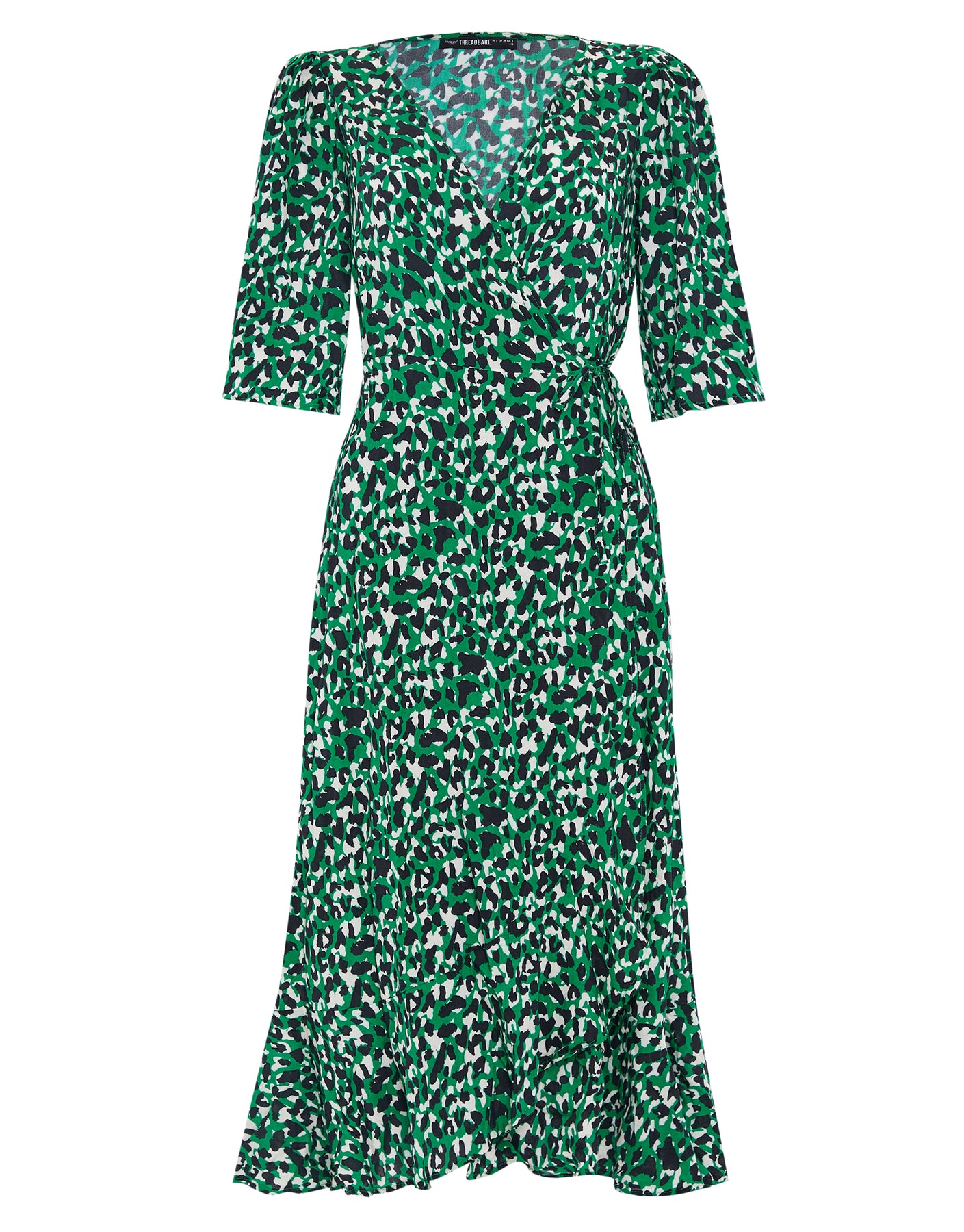 Perfect for gorgeous summer nights and spring evenings, this relaxed Threadbare wrap dress with a pretty frill ruffle hem is in an all-over green leopard print and flows to the mid calf for the perfect midi length.