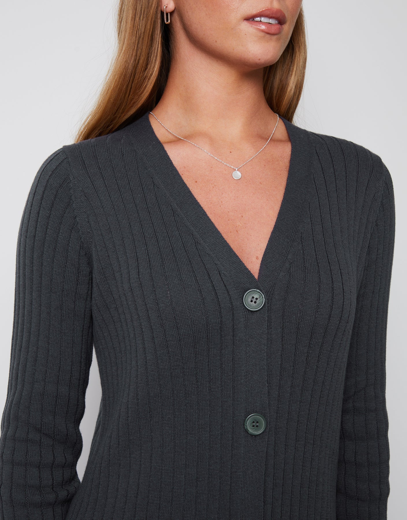 Long-sleeved with ribbed cuffs, this knitted dress is button down and has a soft V neckline, while the cast-off hem gives it a relaxed finish.