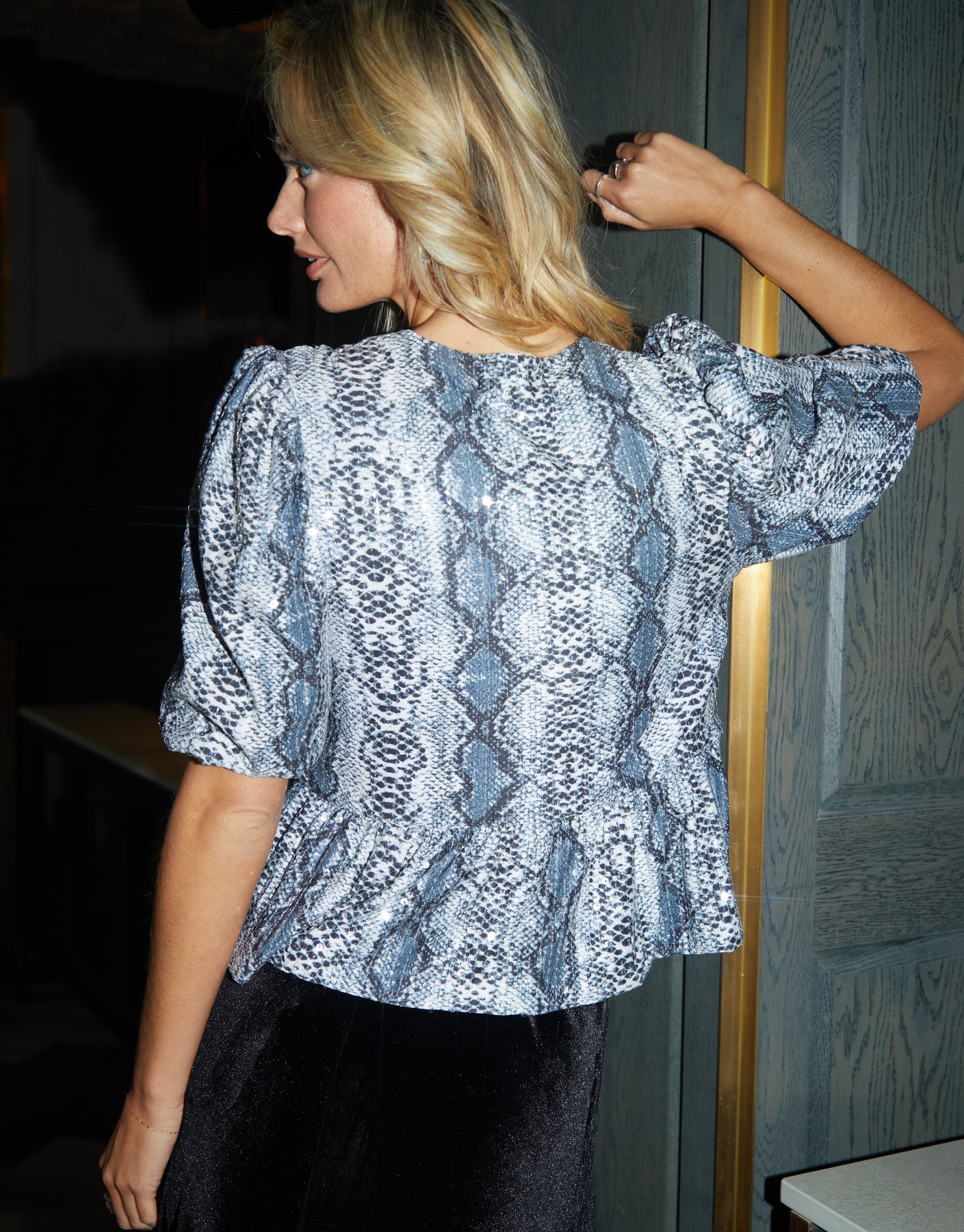 Style with our matching trousers for a full snake print sequin co-ord, or pair with our black velvet midi skirt and a black pump.