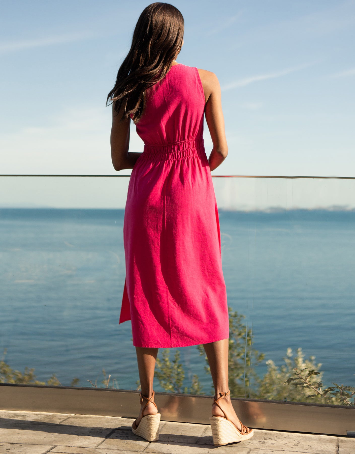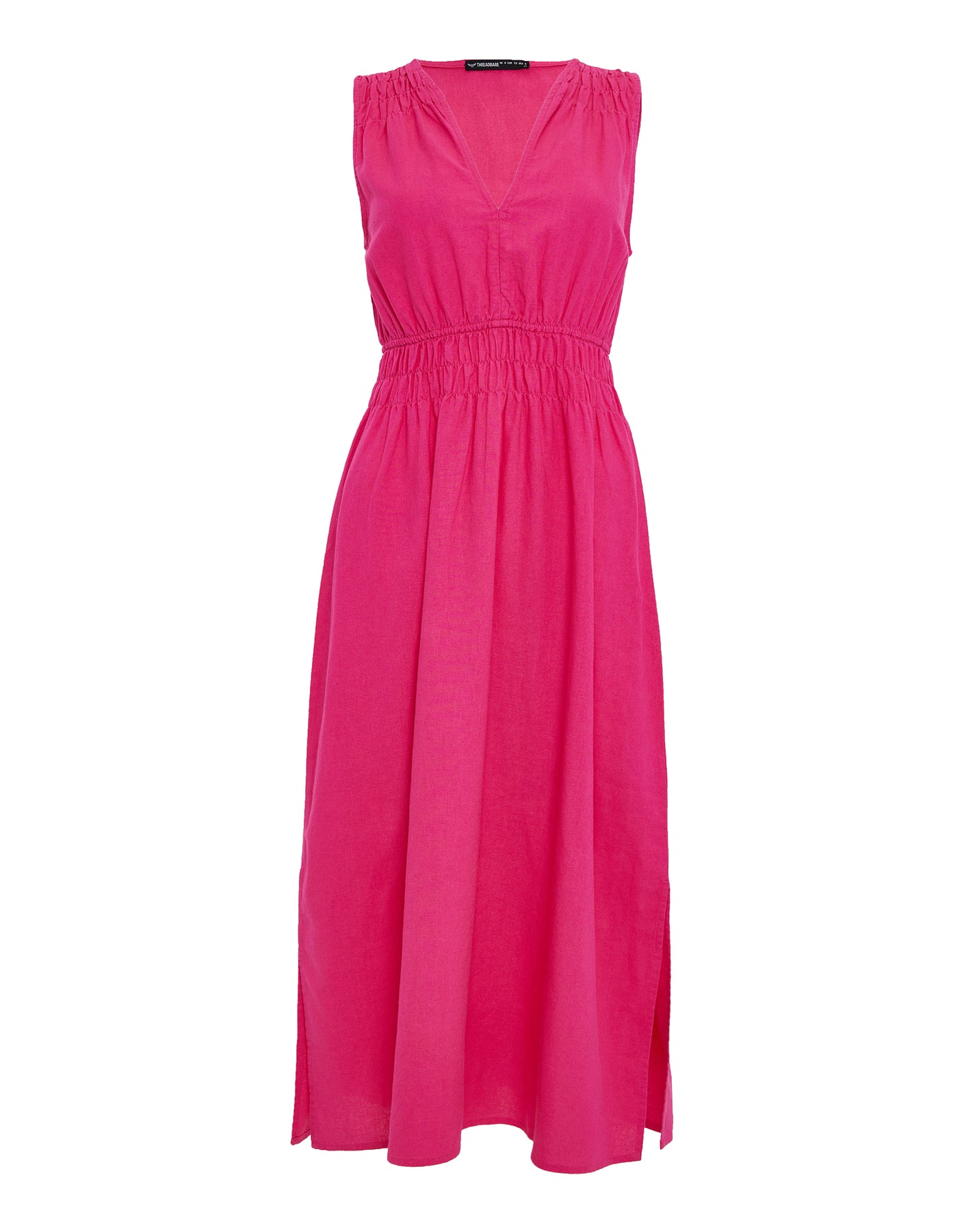 Channel Riviera vibes with our Threadbare hot pink ruched waist midi dress.