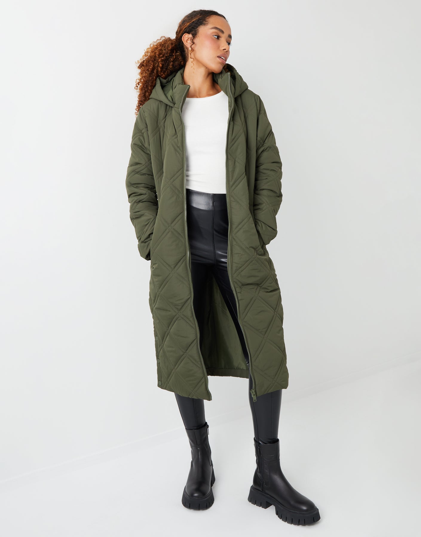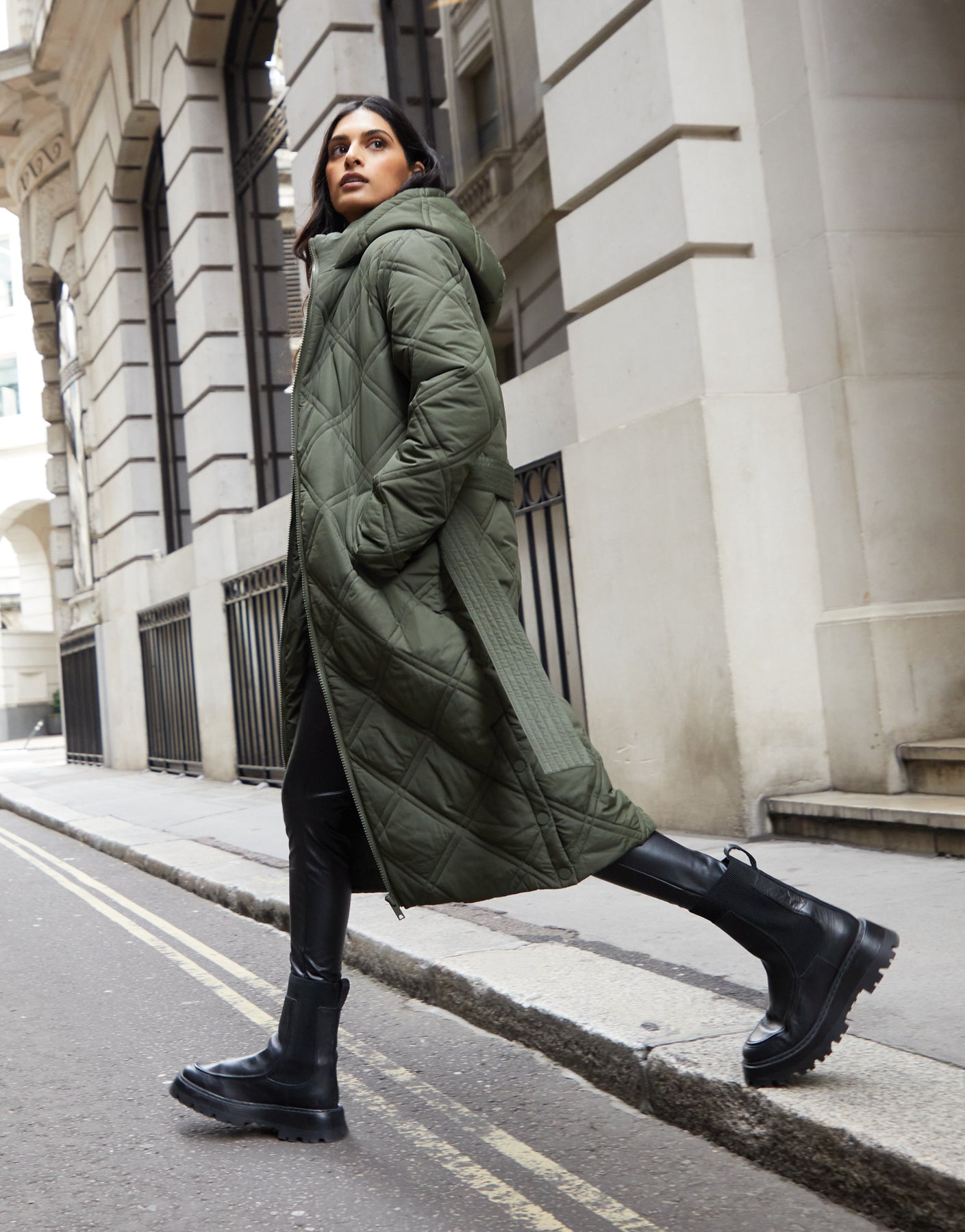 Complete with a snug three-piece hood and high neck padded collar, this hooded padded jacket has stylish diamond quilting and fastens with a full zip. Tie the stitched detail belt at the waist to flatter your figure and add interest, and move freely with snap poppers at the side seams.
